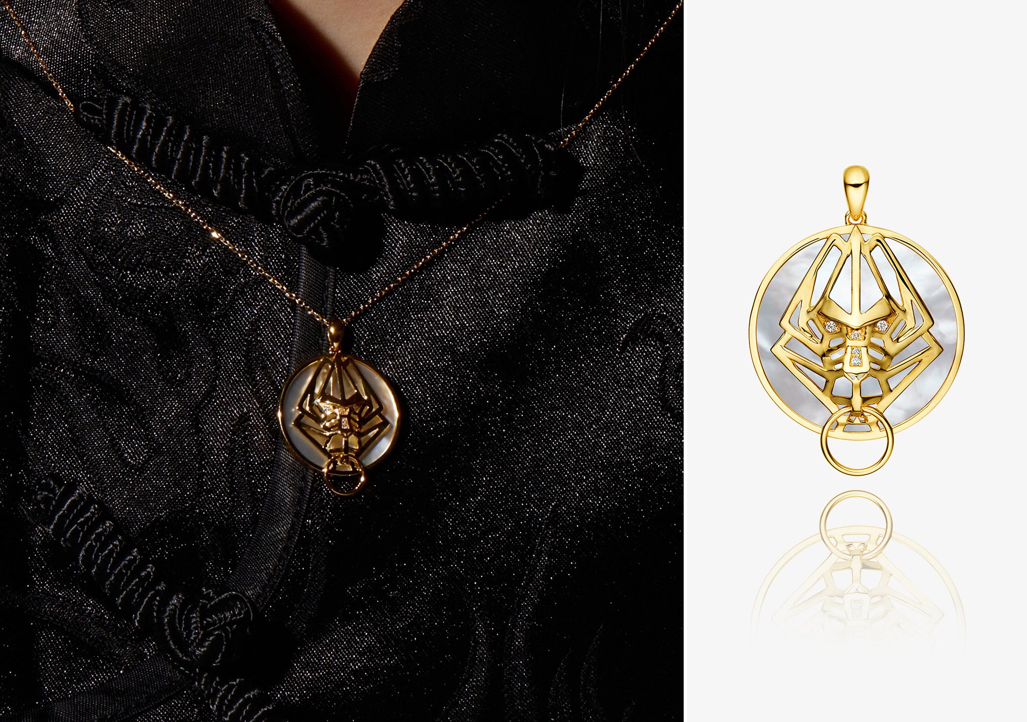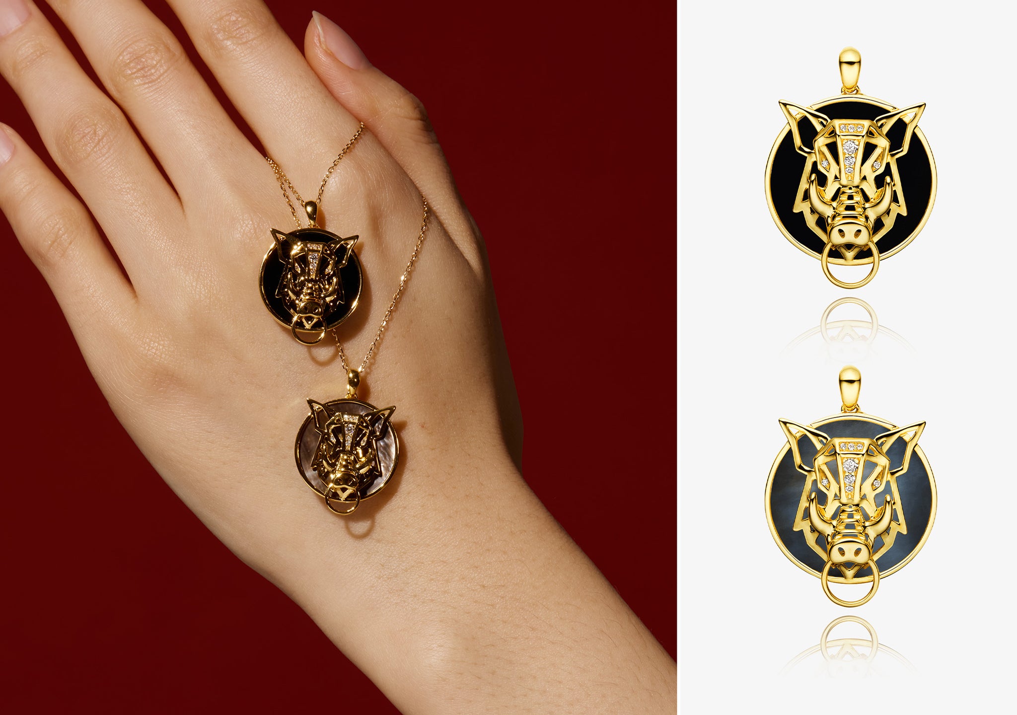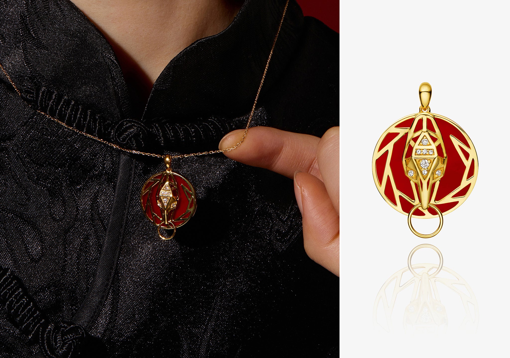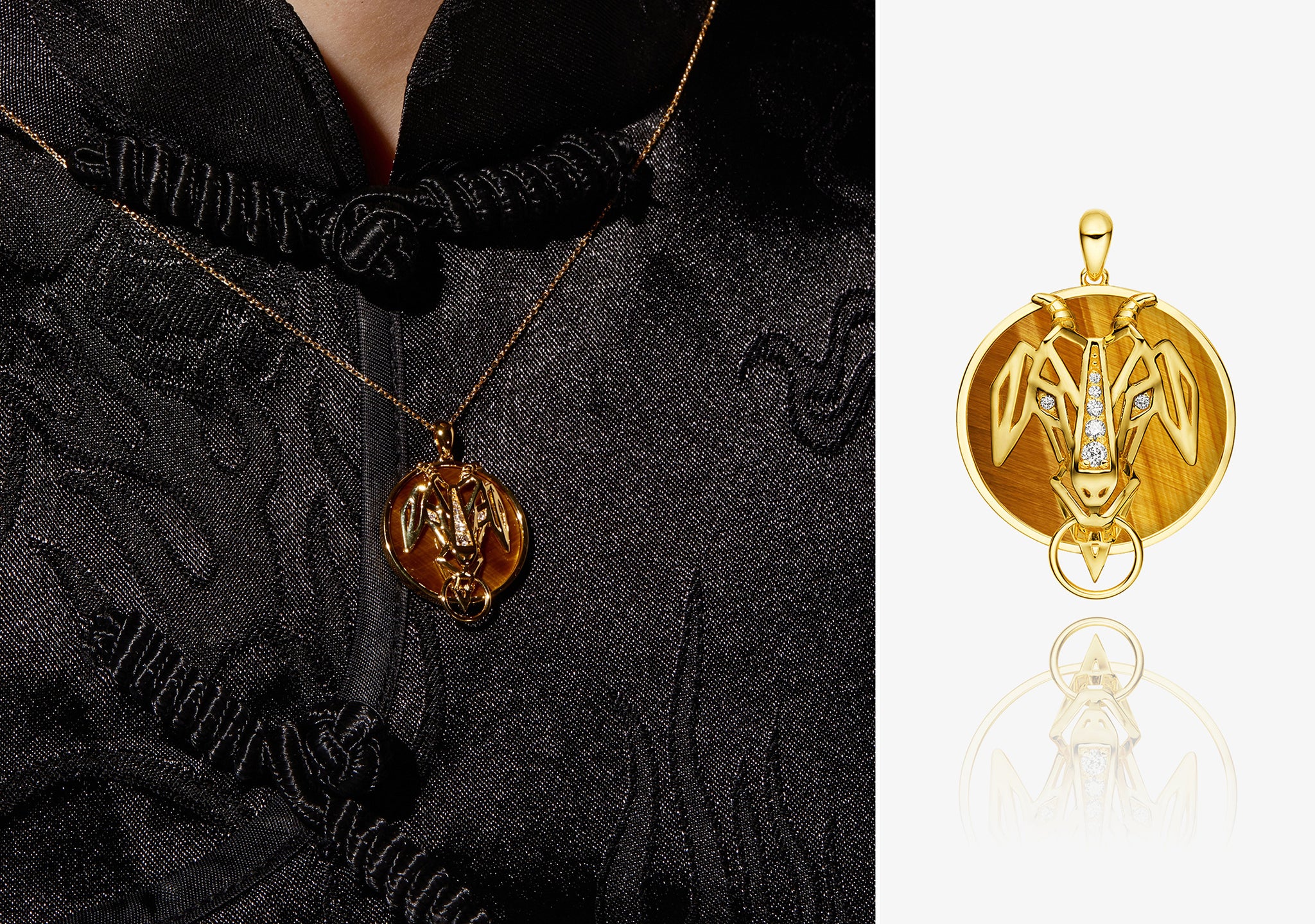 Chinese door knockers are shaped like beast heads holding a ring in their mouths. The beast heads have flinty eyes and a majestic look to guard the house and keep menacing spirits away. The ring in their mouths can be swung to act as a doorbell when people visit their families and friends. To celebrate Chinese traditions, each animal totem in Zaiyou Jewelry‘s Chinese Zodiac Collection holds a ring in its mouth and has lab-grown diamonds set in its eyes and nose to emphasize its powerful presence and protective charm. The totems are designed to be simple and modern, yet they also have a spatial depth, as if the animals are lunging out of the pendant.