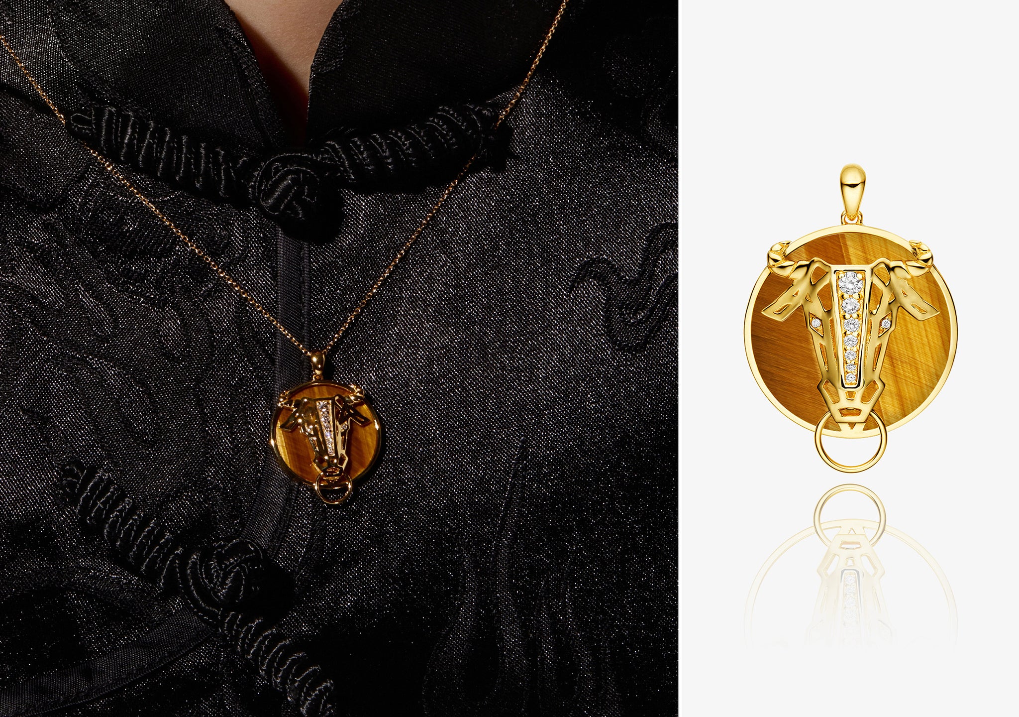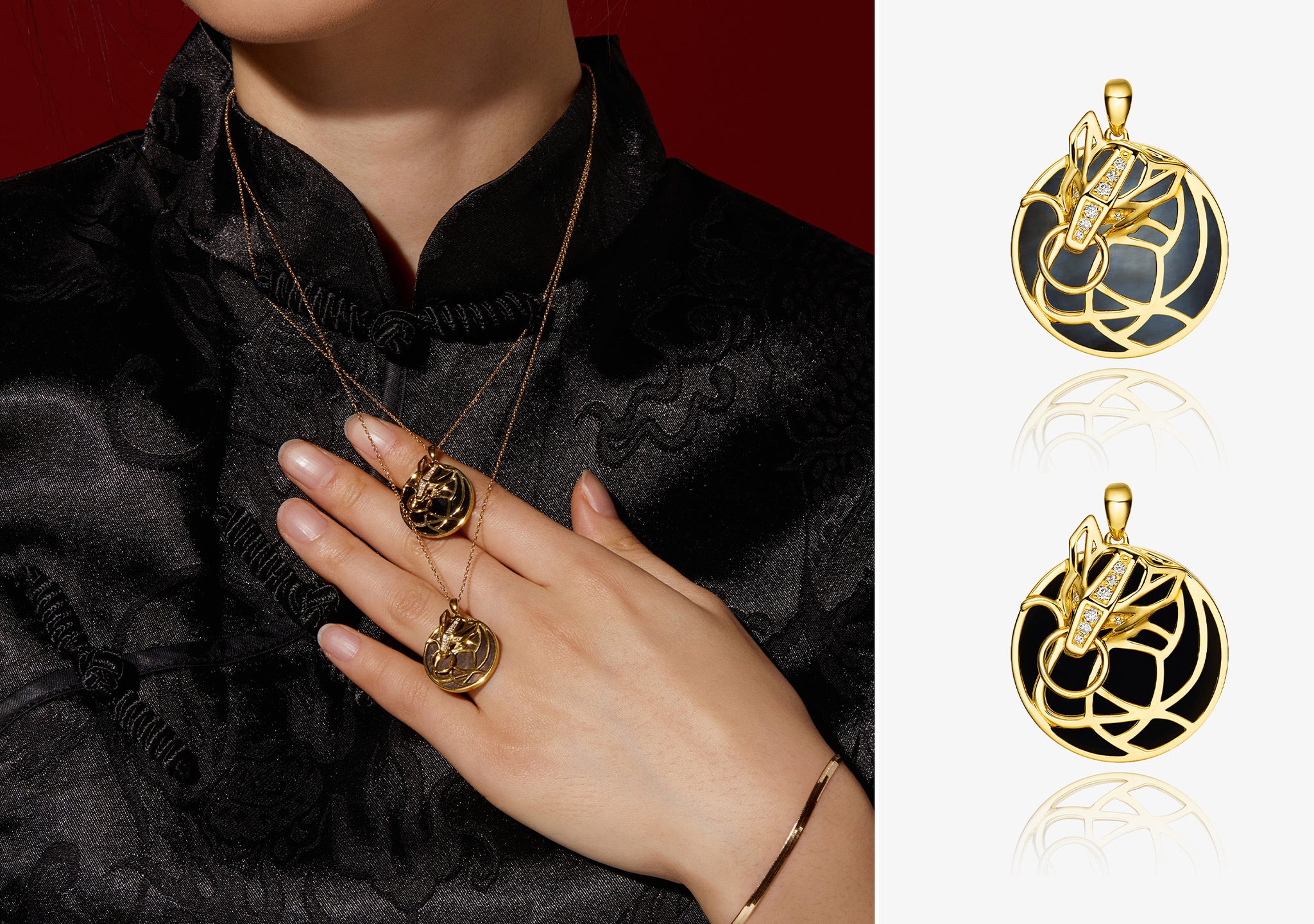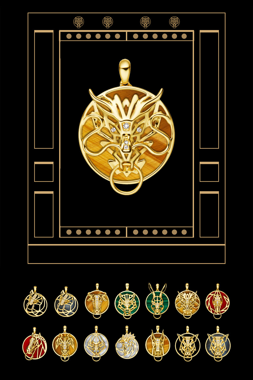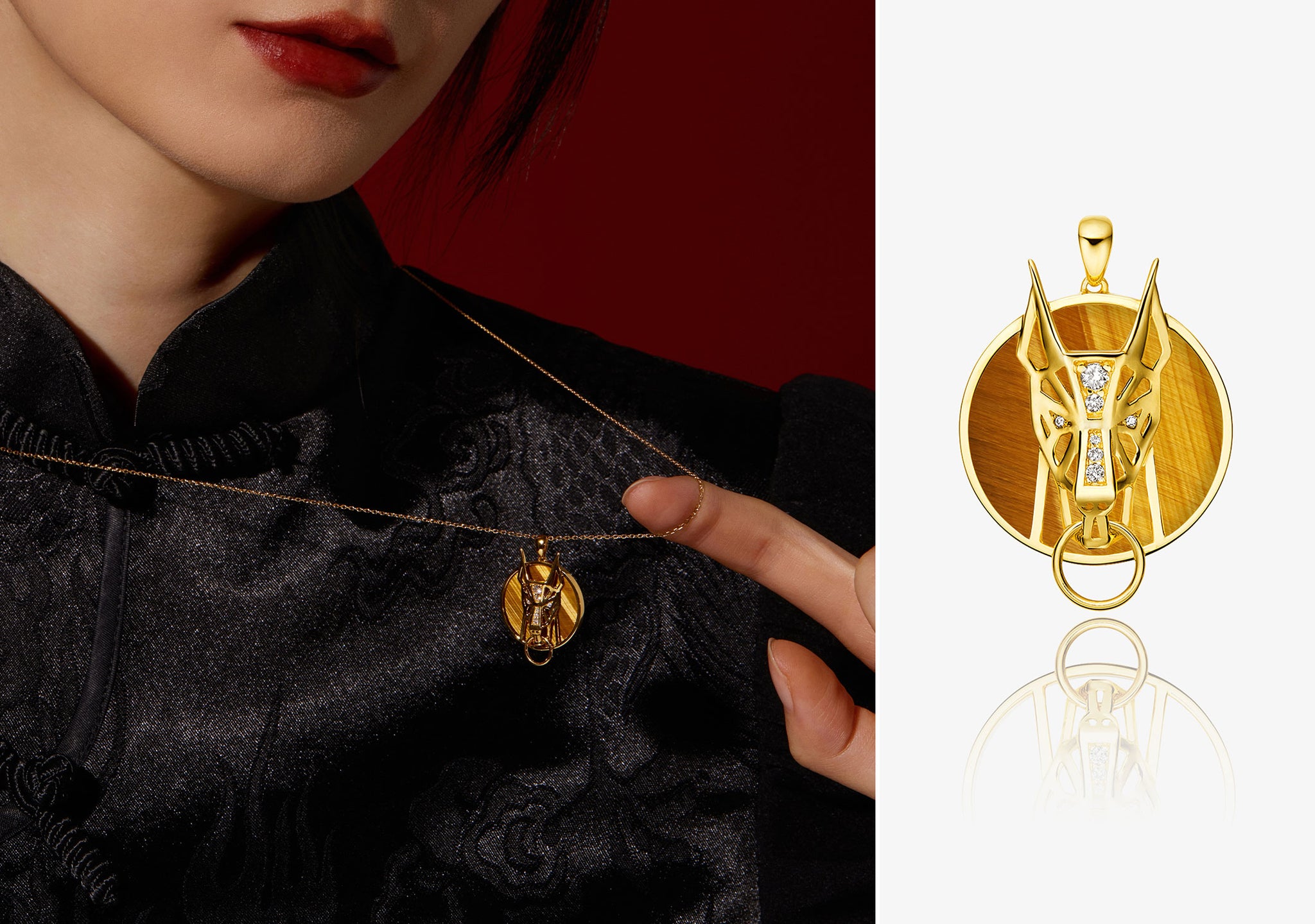 Chinese door knockers are shaped like beast heads holding a ring in their mouths. The beast heads have flinty eyes and a majestic look to guard the house and keep menacing spirits away. The ring in their mouths can be swung to act as a doorbell when people visit their families and friends. To celebrate Chinese traditions, each animal totem in Zaiyou Jewelry‘s Chinese Zodiac Collection holds a ring in its mouth and has lab-grown diamonds set in its eyes and nose to emphasize its powerful presence and protective charm. The totems are designed to be simple and modern, yet they also have a spatial depth, as if the animals are lunging out of the pendant.