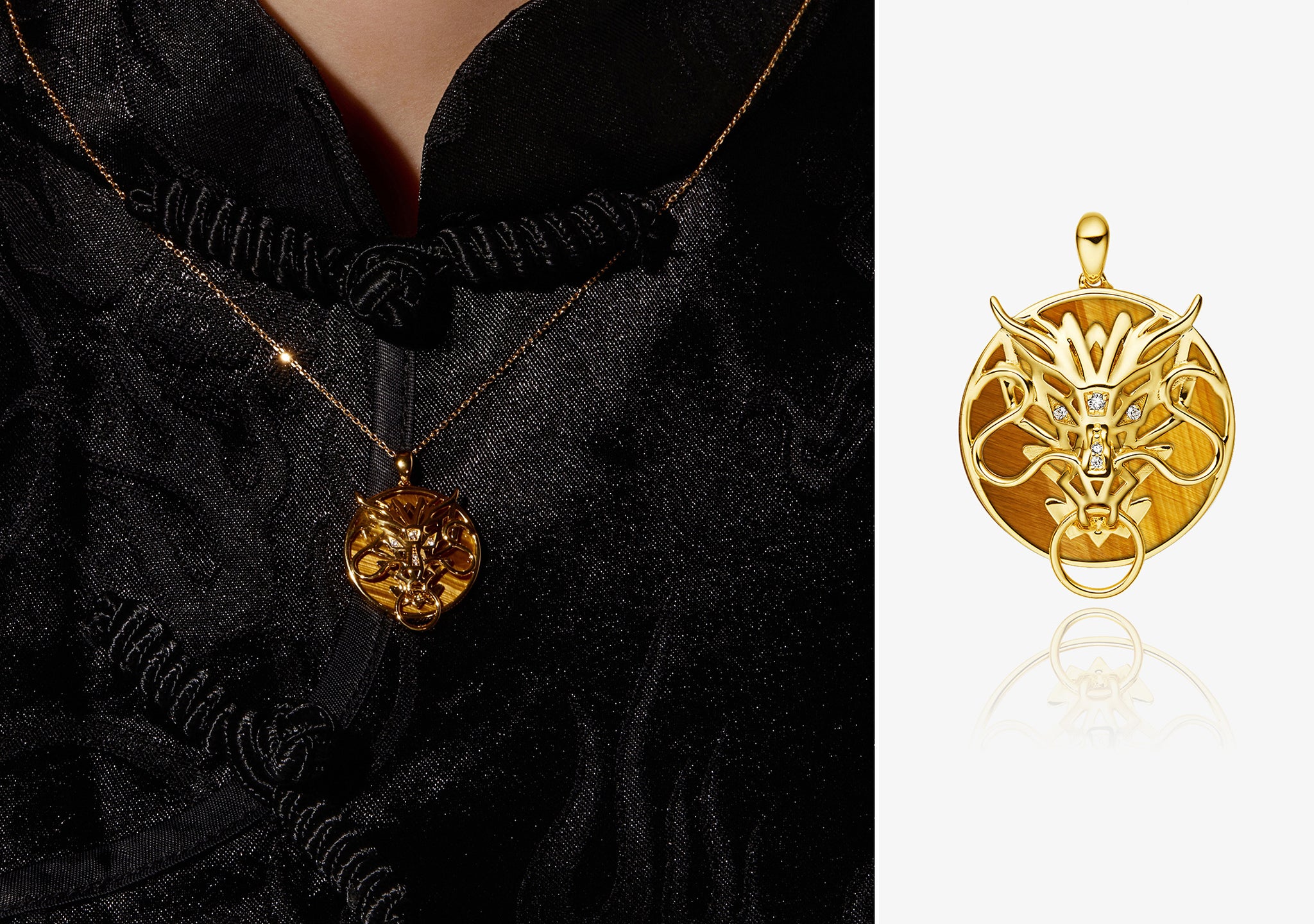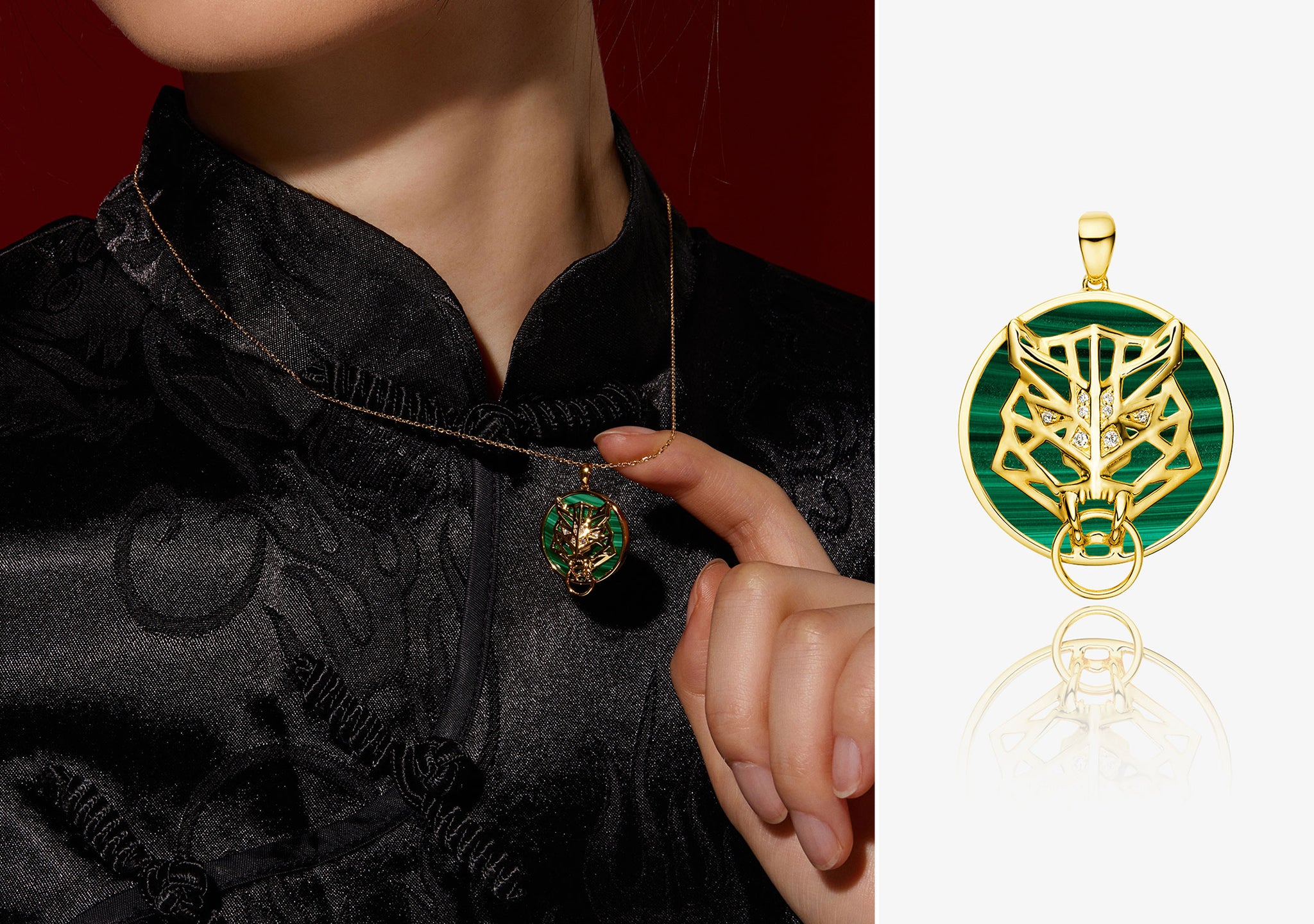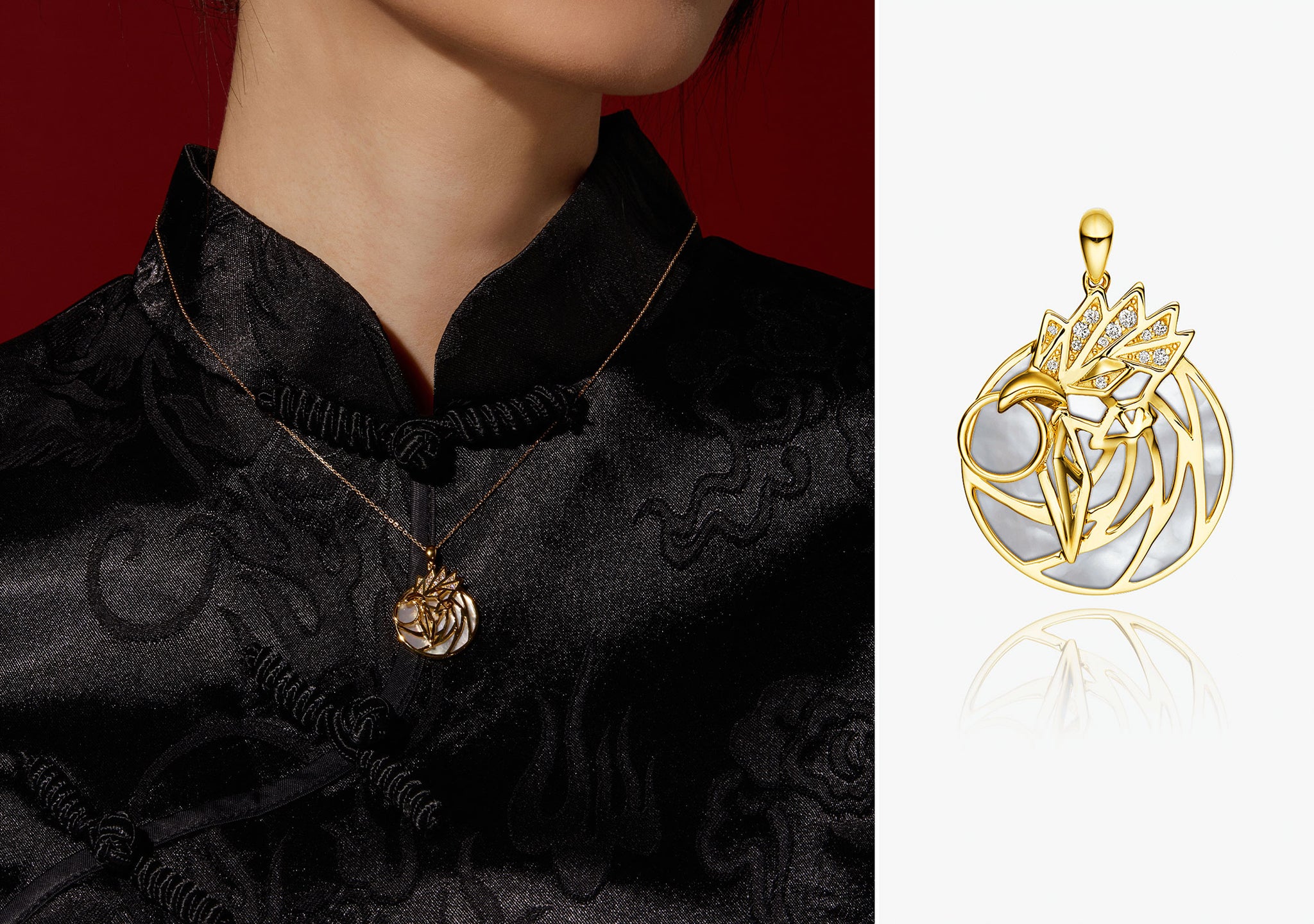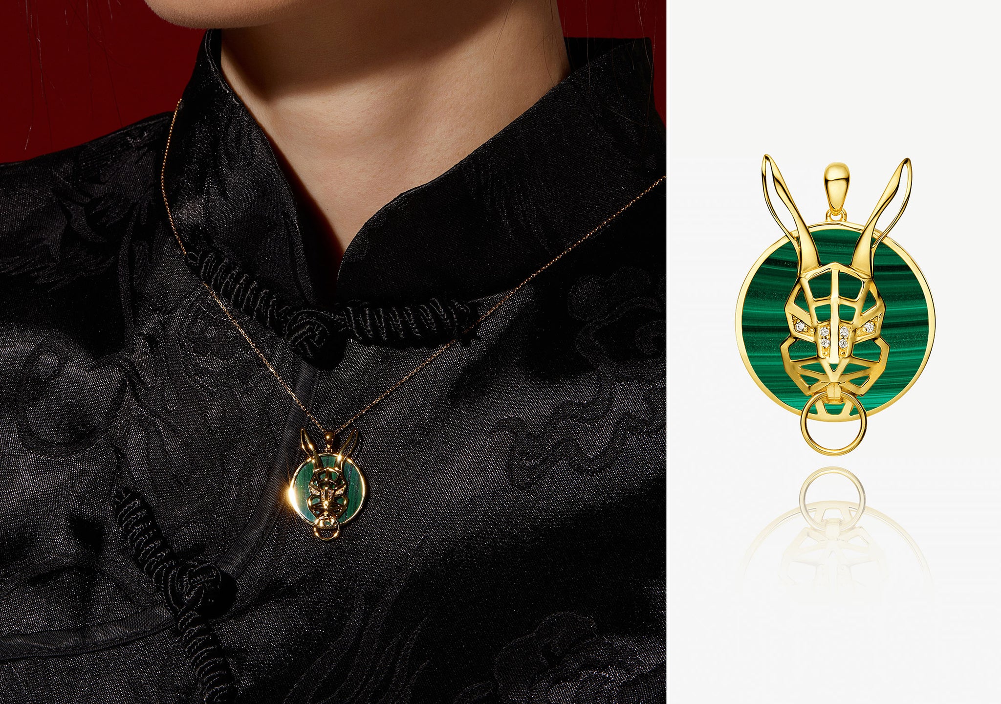Chinese door knockers are shaped like beast heads holding a ring in their mouths. The beast heads have flinty eyes and a majestic look to guard the house and keep menacing spirits away. The ring in their mouths can be swung to act as a doorbell when people visit their families and friends. To celebrate Chinese traditions, each animal totem in Zaiyou Jewelry‘s Chinese Zodiac Collection holds a ring in its mouth and has lab-grown diamonds set in its eyes and nose to emphasize its powerful presence and protective charm. The totems are designed to be simple and modern, yet they also have a spatial depth, as if the animals are lunging out of the pendant.