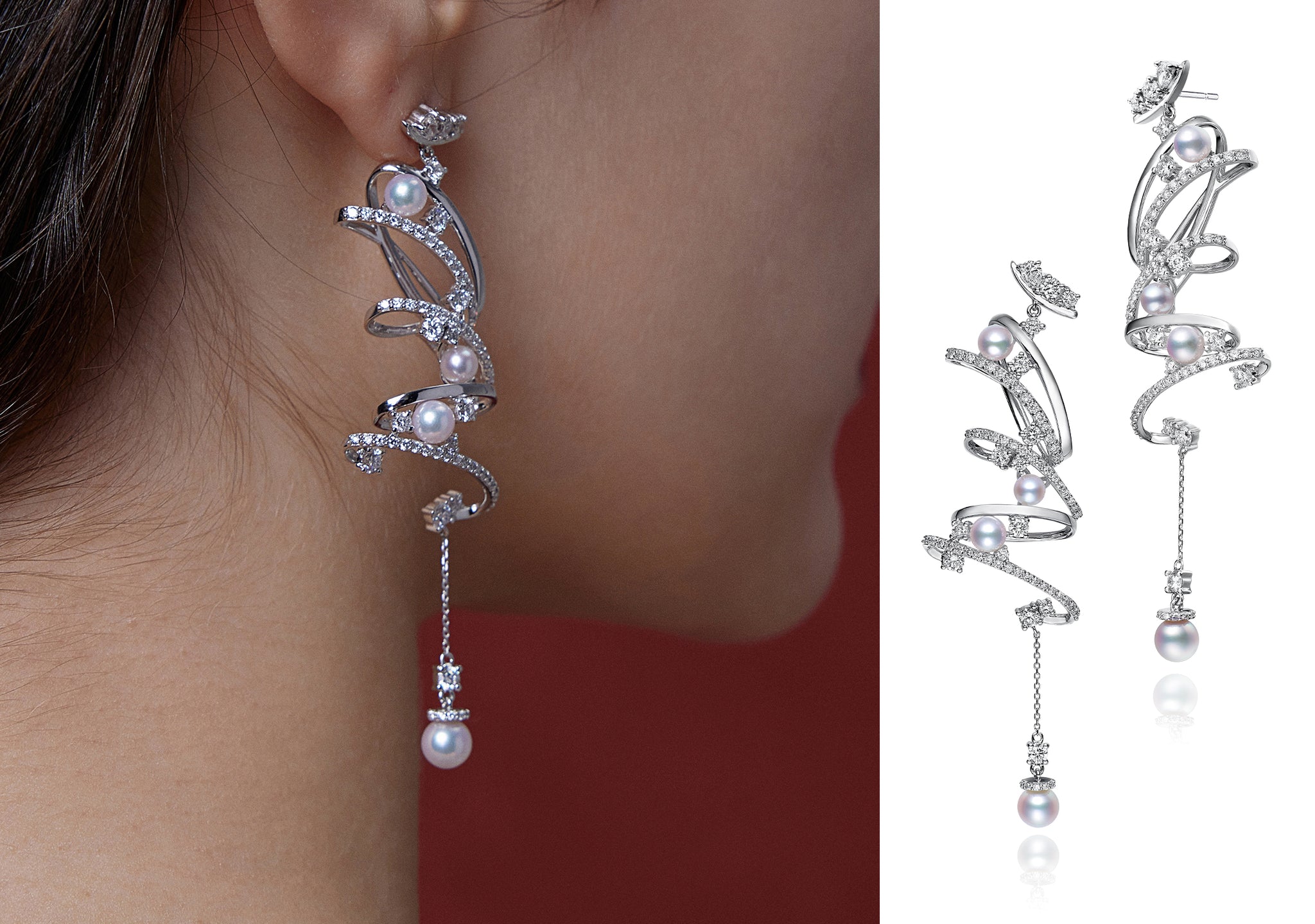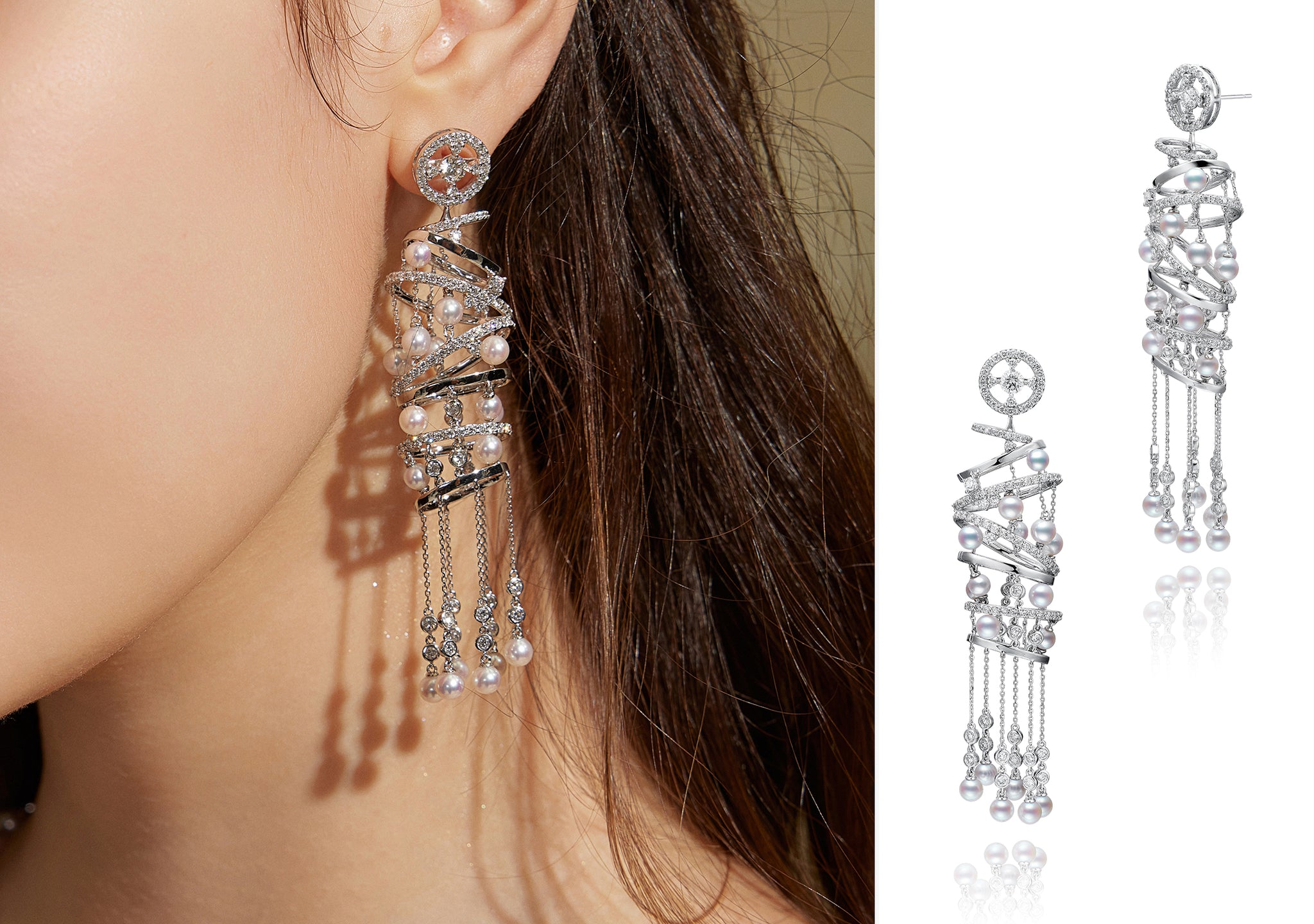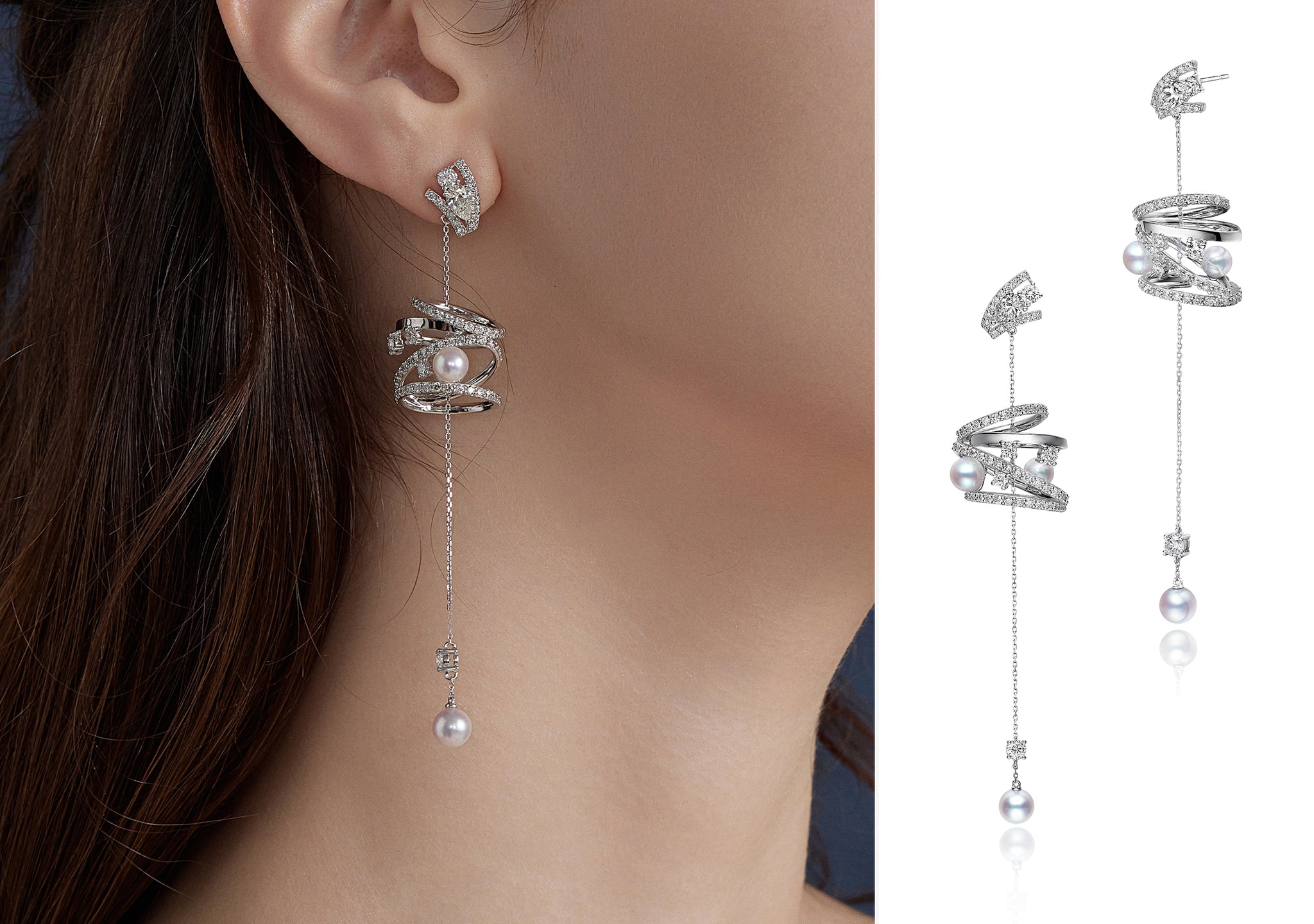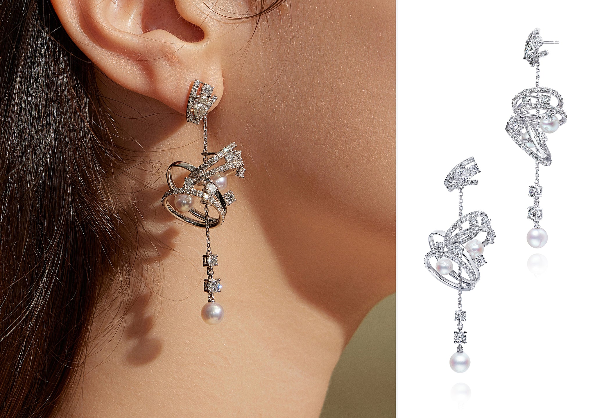 The swirling lines of lab-grown diamonds create a crinoline structure and the slender shape conveys a sense of lightness. The Akoya pearl at the bottom of the drop earrings seems to have escaped the constraints of society, dancing freely with the movement of the body. The imaginative design of this fine jewelry is a tribute to women's self-awareness and free spirit.