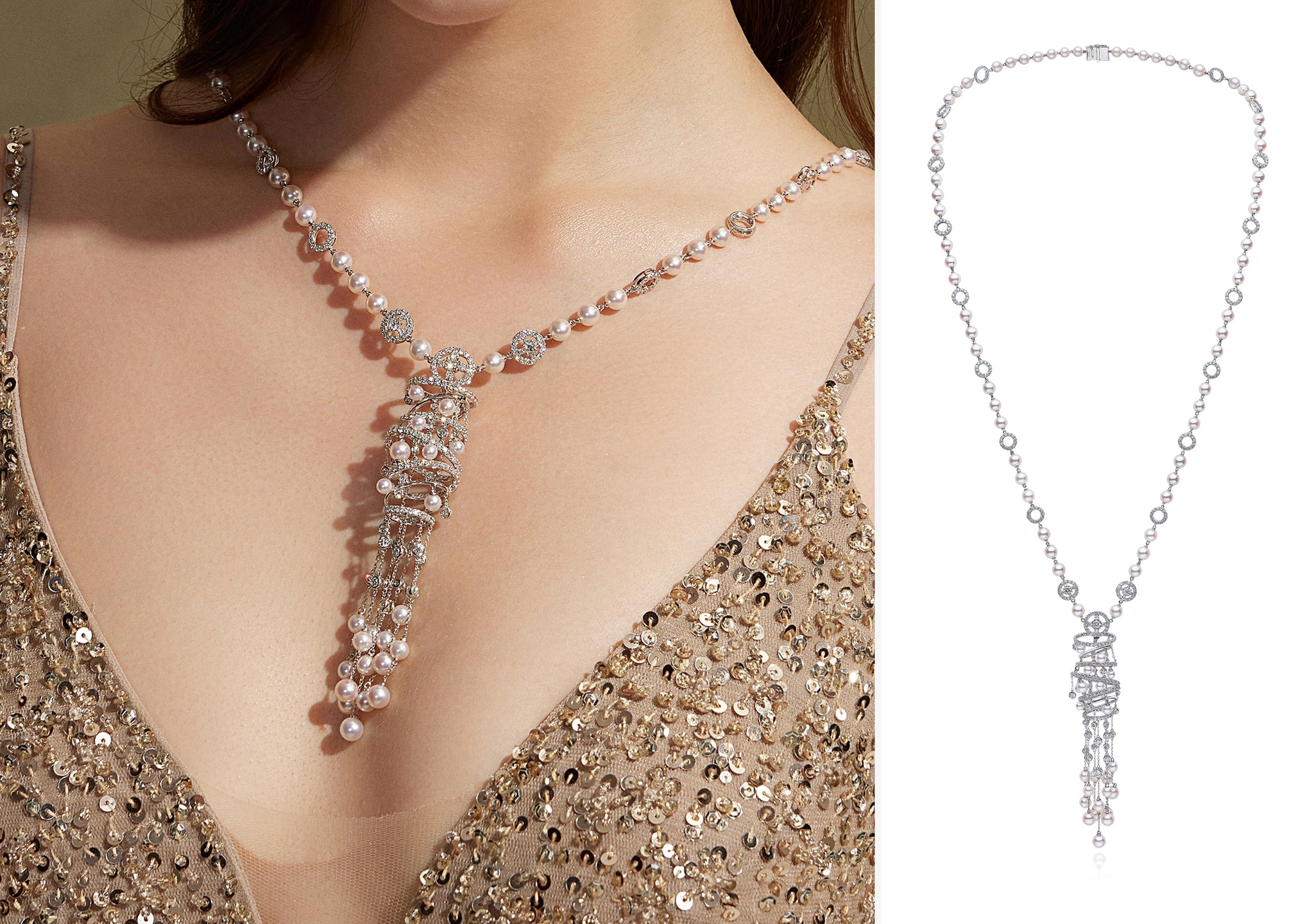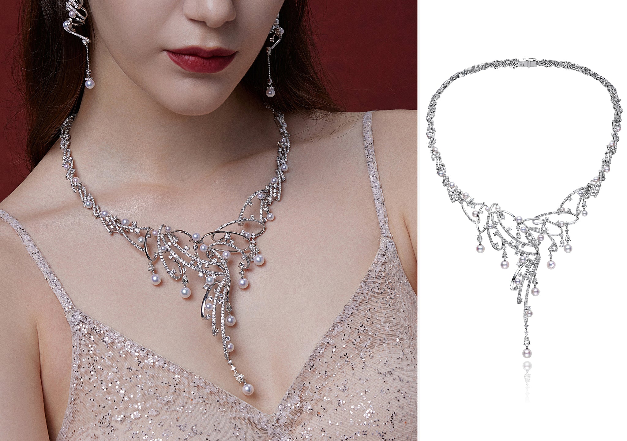 On the necklace chain, the shimmering Akoya pearls and sparkling lab-grown diamonds are arranged in a sequence like a beautiful dance music, creating a clear visual rhythm. The inspiration for the pendant comes from the shape of a crinoline, but the flowing and curved lines are used to represent the rigid structure, expressing a rebellious spirit with a contemporary perspective. The retro and elegant design of this high-end jewelry implies the freedom to express one's own beauty without conforming to mainstream aesthetic rules.