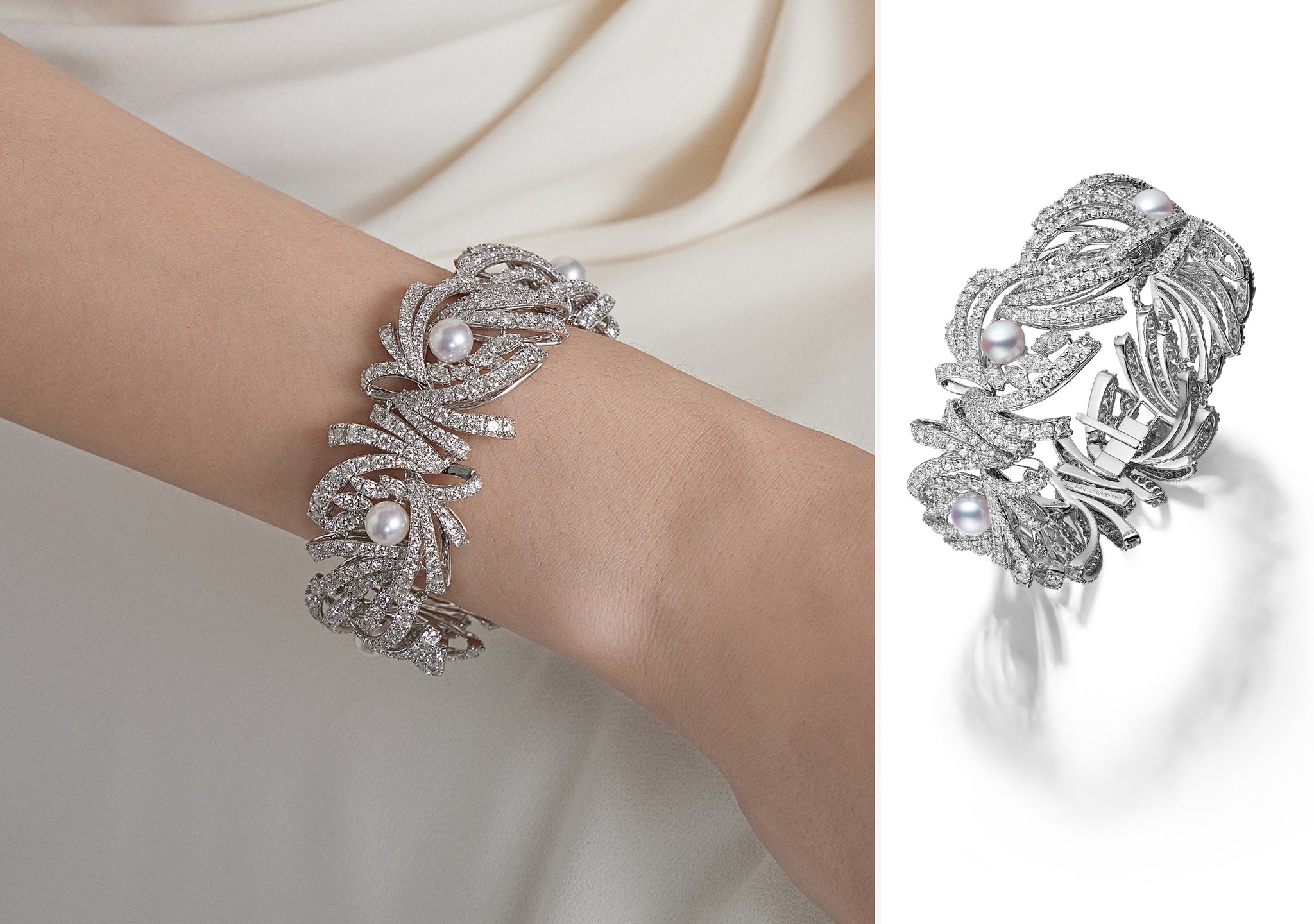 Lab-grown diamonds and Akoya pearls are embellished to create an endless dance of light around your wrist. The shape of the crinoline is interpreted from a modern perspective. The curved lines twist and flow in a circle, but also seem to break the order of the structure. Obeying order and breaking it at the same time, the bracelet symbolizes a clear sense of self and a desire for freedom.