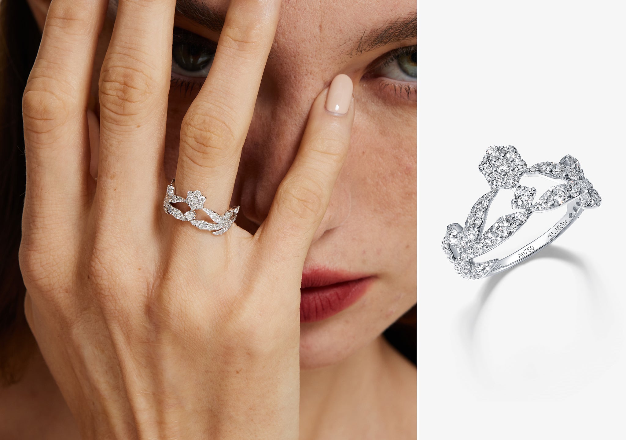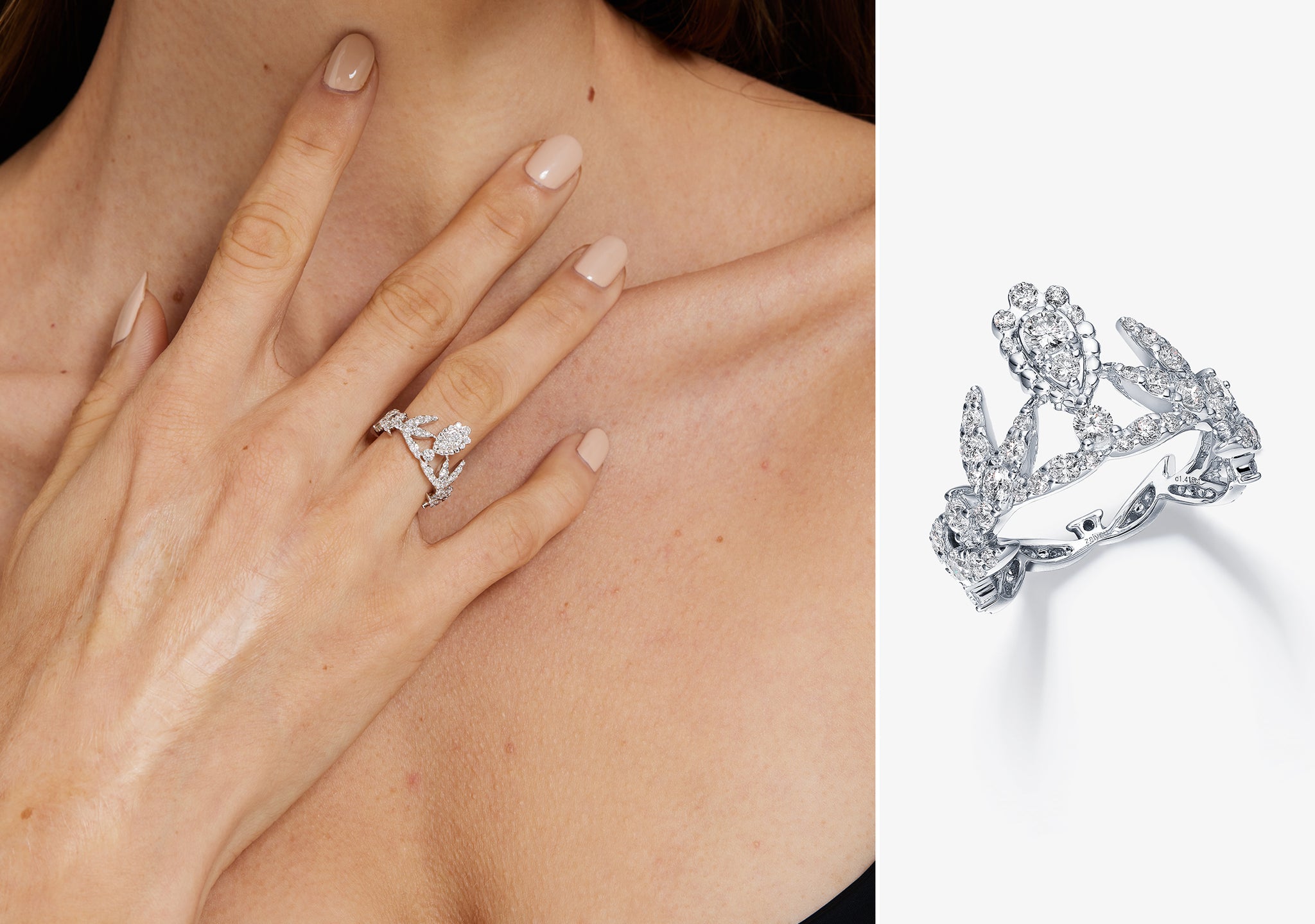 The Laurel Wreath Tiara Lab Diamond Ring is inspired by the Marichalar Meander Tiara. The Marichalar Meander Tiara was a wedding gift to Infanta Elena of Spain as a wedding present, and it combines the laurel wreath and the meander motifs. The Laurel Wreath Tiara Ring is a fashionable twist on the Marichalar Meander Tiara. Slim laurel leaves grow freely towards the sky, weaving together a diamond laurel wreath holding up the clustered center stone as a crown of flower. This lively diamond ring captures the vital energy of life and eternalizes the tension of life in its delicate design. This fashion diamond ring can be worn with any outfit and will infuse an extra shot of energy into your look.