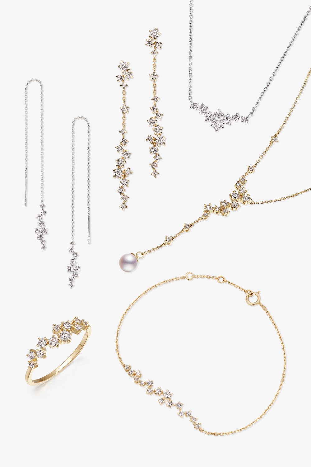 Clustered melee lab-grown diamonds form delicate floral patterns on vines made with 14-karat gold. The necklace in this collection also has an Akoya pearl to add another layer of shine to your look. These simple yet elegant designs will give you an effortless chic look when worn alone. However, when you layer them with other pieces of jewelry, the exquisite floral patterns give off a fresh yet luxurious vibe, like a cascading rain of flowers in a floral path. Feel the fragrant spring breeze with the unique jewelry in the Blooming Collection.