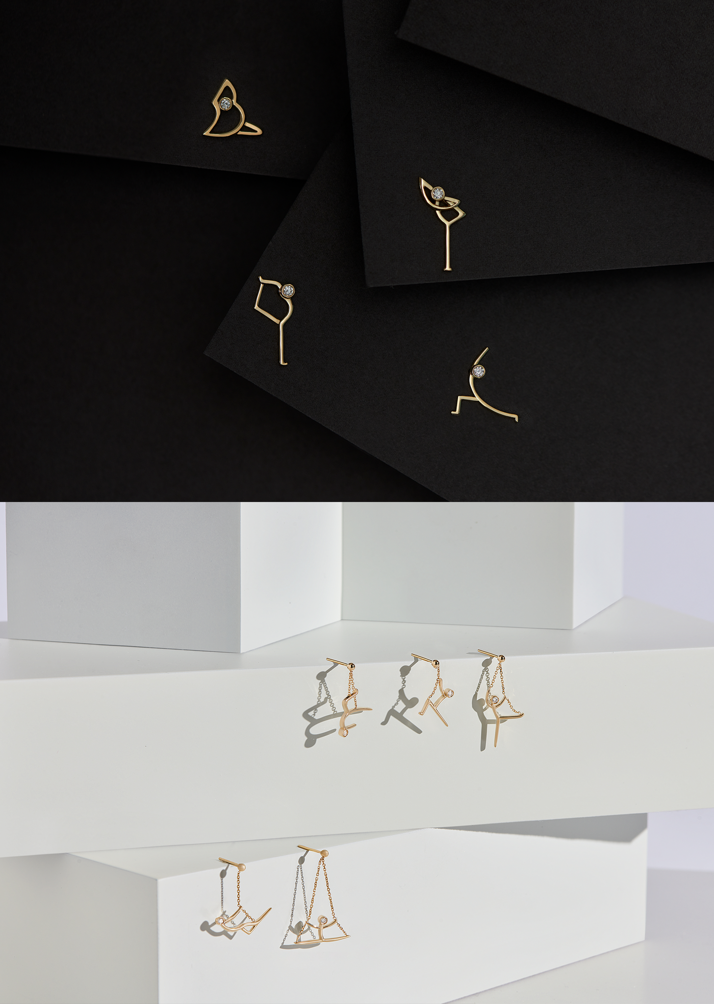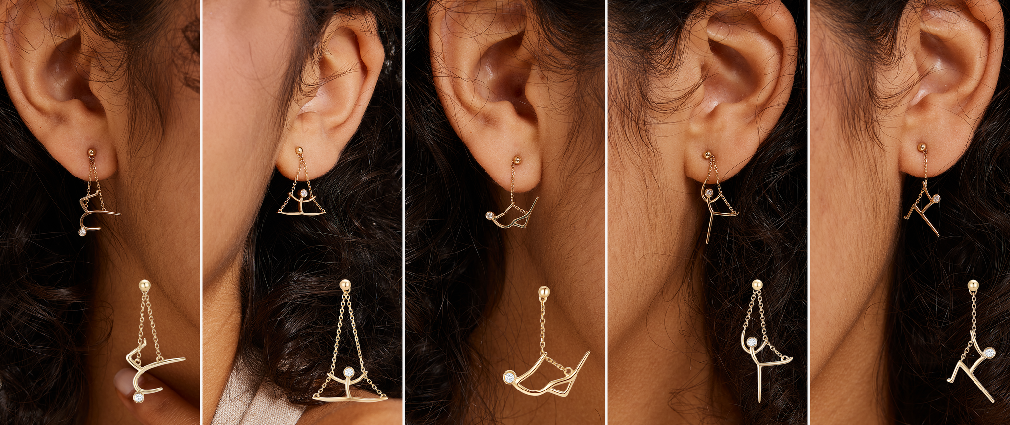 For those who prefer earrings with a more slender shape, this collection also ingeniously incorporates aerial yoga poses into a delicate drop earring design. We have aerial warrior pose, T-balance pose, aerial swallow pose, suspended splits pose, and aerial stag pose in this category.