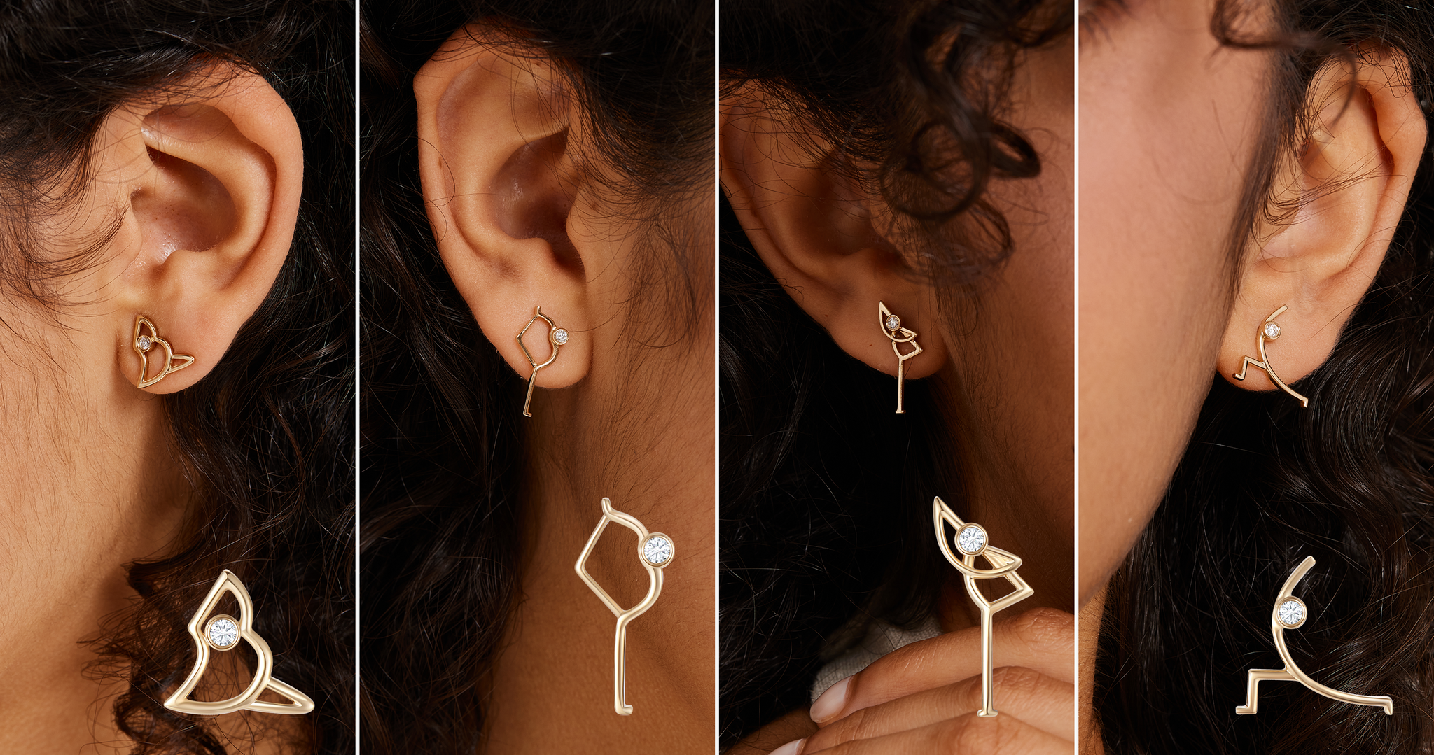 The Energy-Yoga Collection is wonderfully fun and unique as it incorporates yoga postures into stud and drop earring designs. 9 karat and 14 karat gold composes the gracefully curved body of a yoga practitioner and a shimmering lab-grown diamond forms the head. We have crescent moon pose, standing bow pose, dancer’s pose, and pigeon pose as stud earrings.