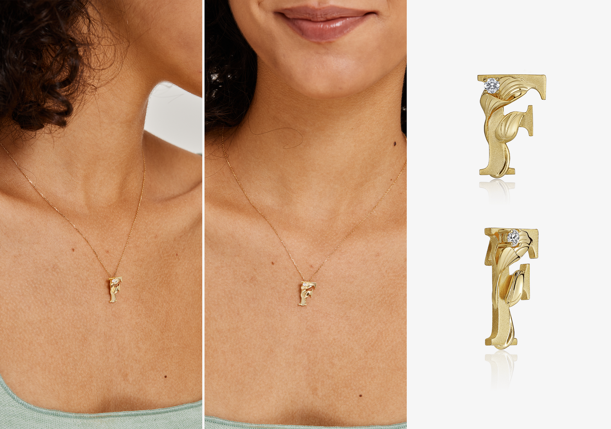 "F" stands for Flamingo flower. With its open, heart-shaped leaves and tropical disposition, it's no wonder it has come to symbolize hospitality. It clings to the letter F and climbs upward, presenting a shimmering 2.3mm round lab-grown diamond for a unique initial jewelry piece.