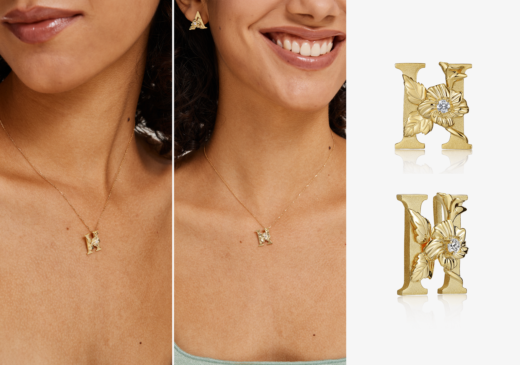 "H" for Hibiscus represents tenderness and eternal beauty. This delicate flower is intertwined with the letter H, and a 2.3mm lab-grown diamond initial that glitters at the center.