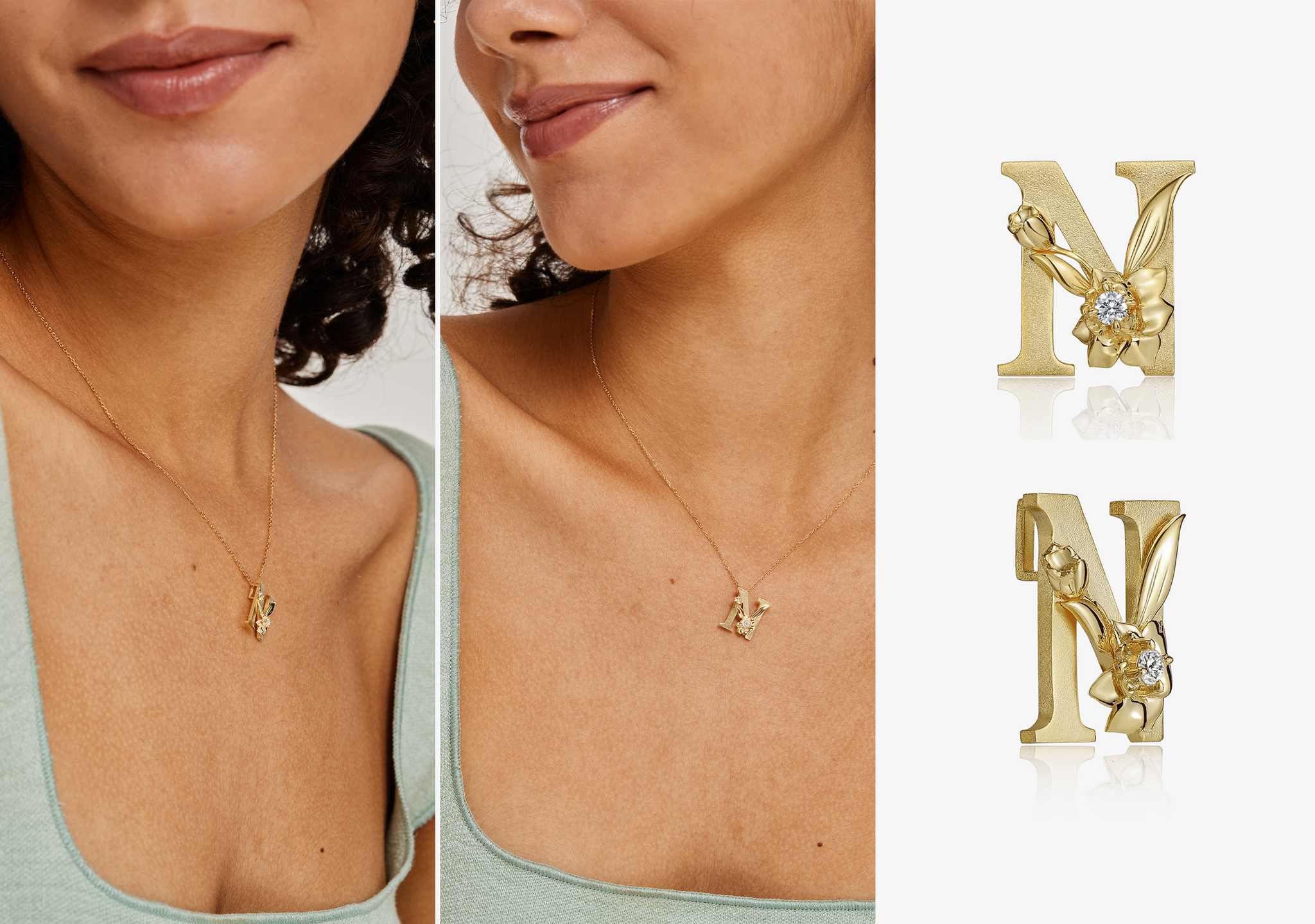 "N" is for Narcissus, which symbolizes new beginnings and innocence. It is often the first flower we see blooming after the cold winter. On this diamond letter pendant, the Narcissus seems to burst through glittering snow to welcome the arrival of spring.