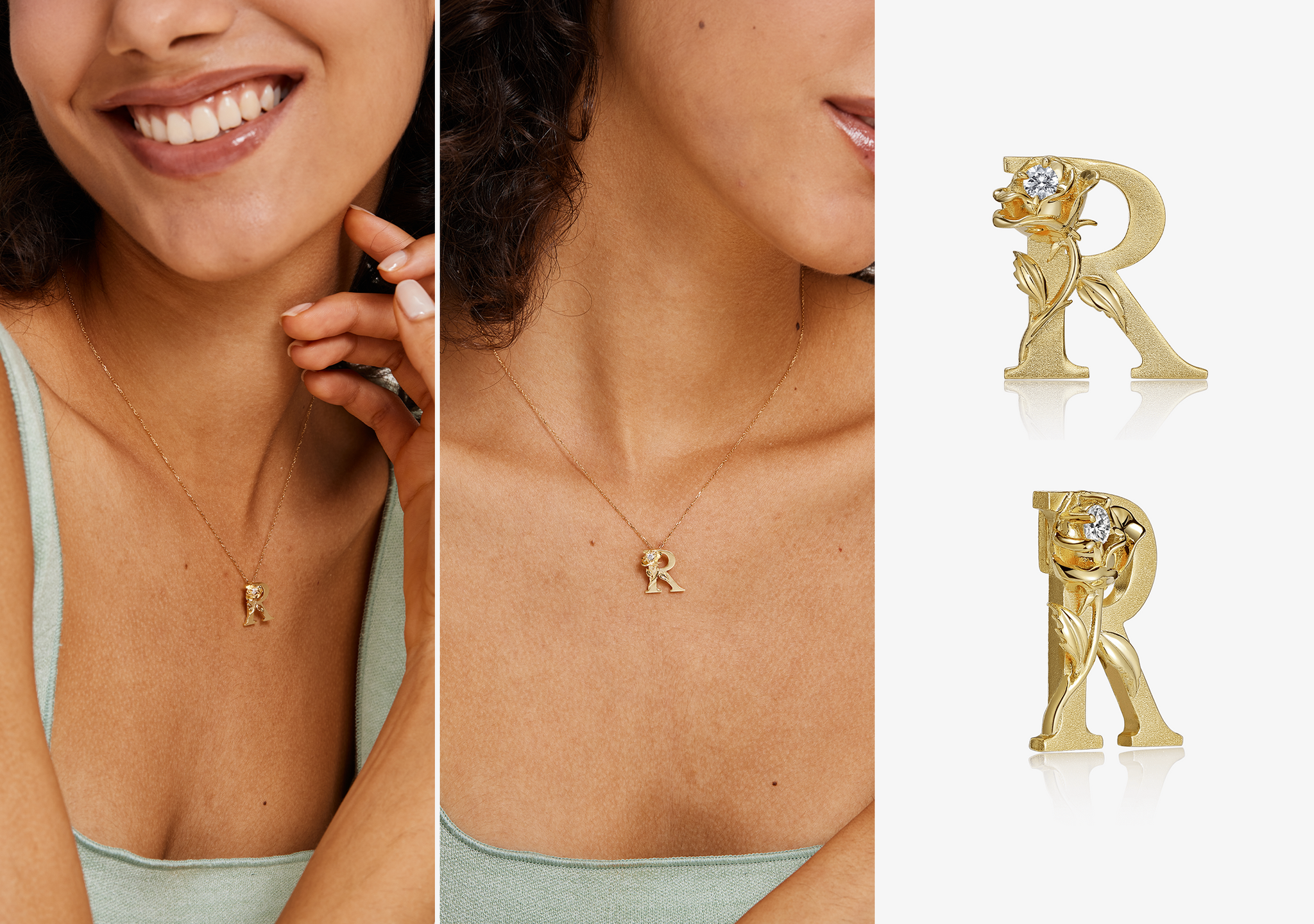 "R" stands for Rose, an emblement of pure and beautiful love. This letter pendant is adorned with a high-polish yellow gold rose and a 2.3mm lab-grown diamond, enhancing its allure.