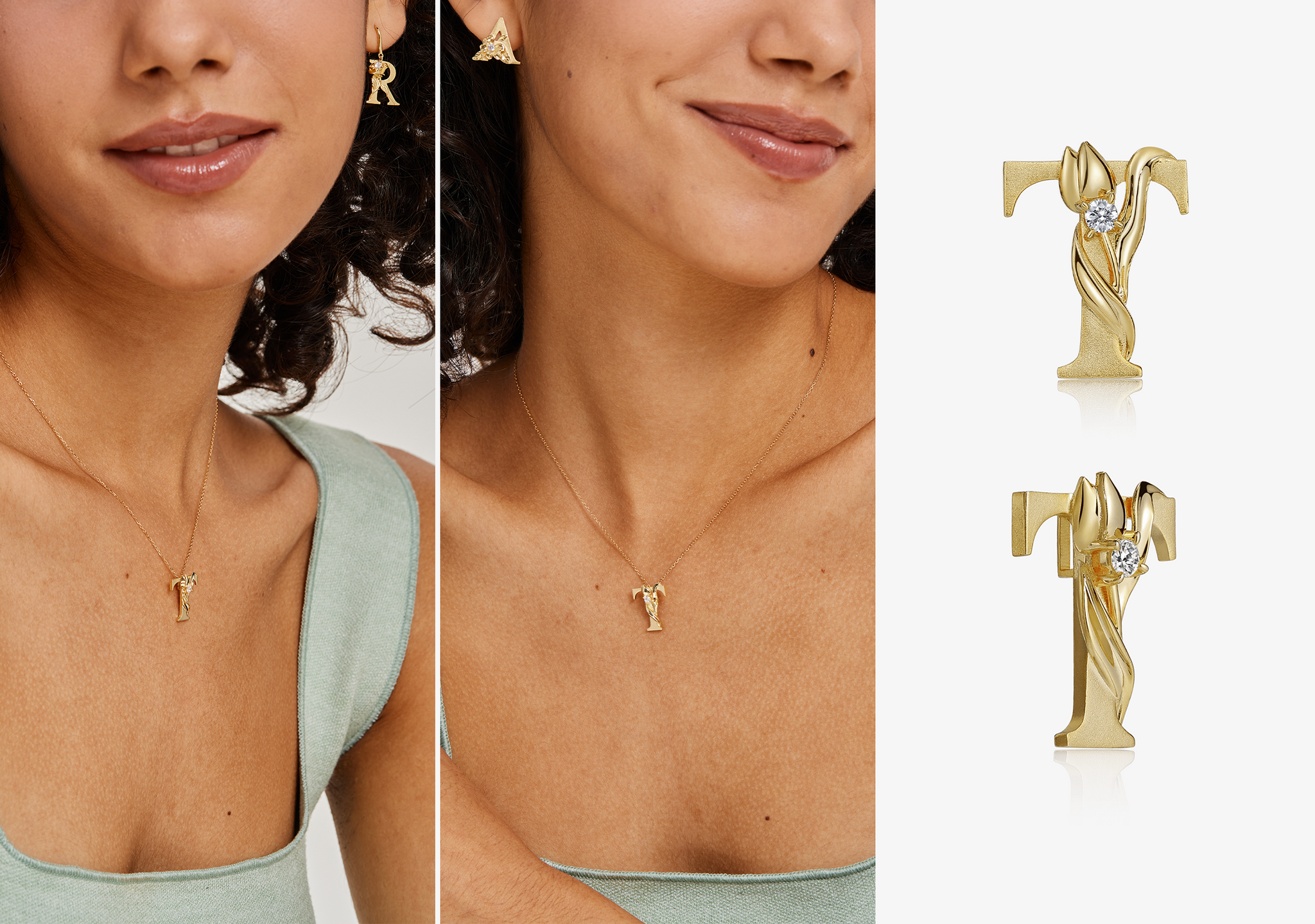 "T" represents the Tulip, which is adored worldwide and symbolizes deep love. On this floral jewelry, the letter "T" is wrapped by Tulip leaves, and a dazzling round lab-grown has magnified the brilliance of the corolla.