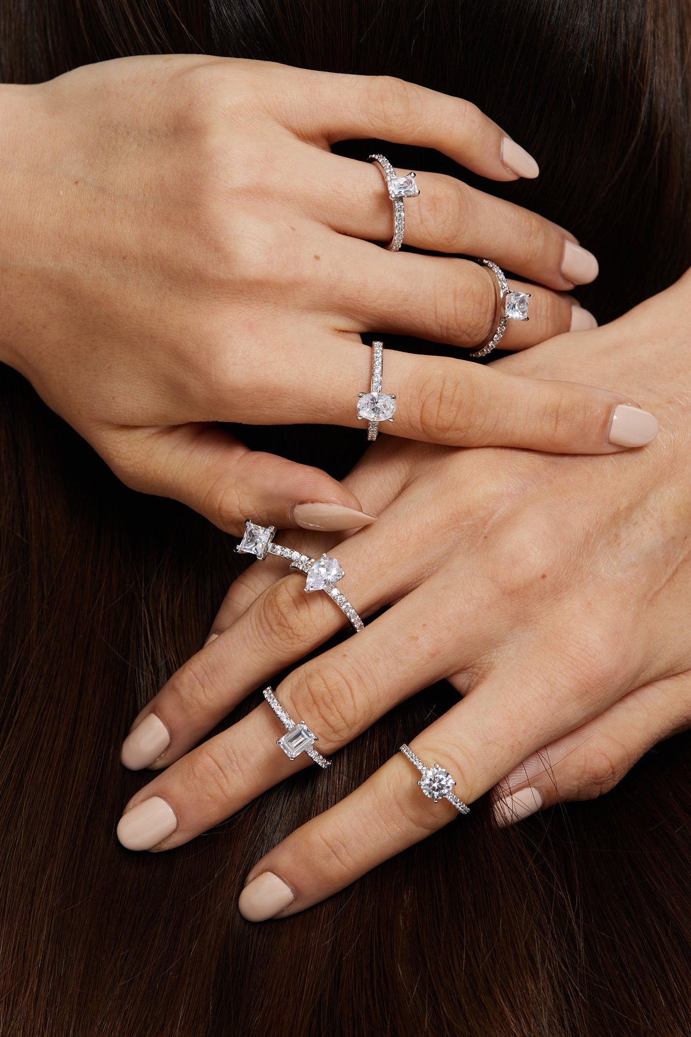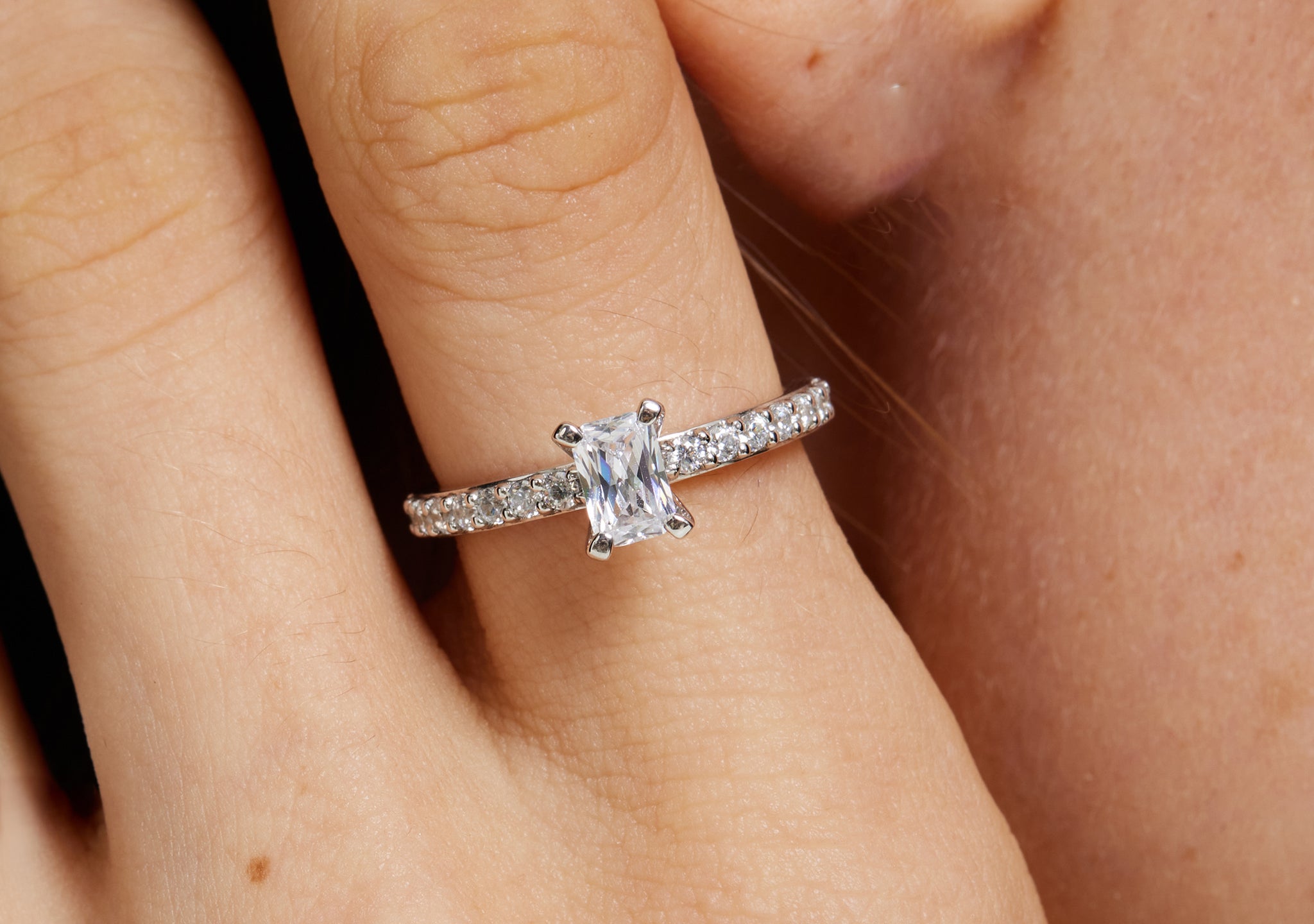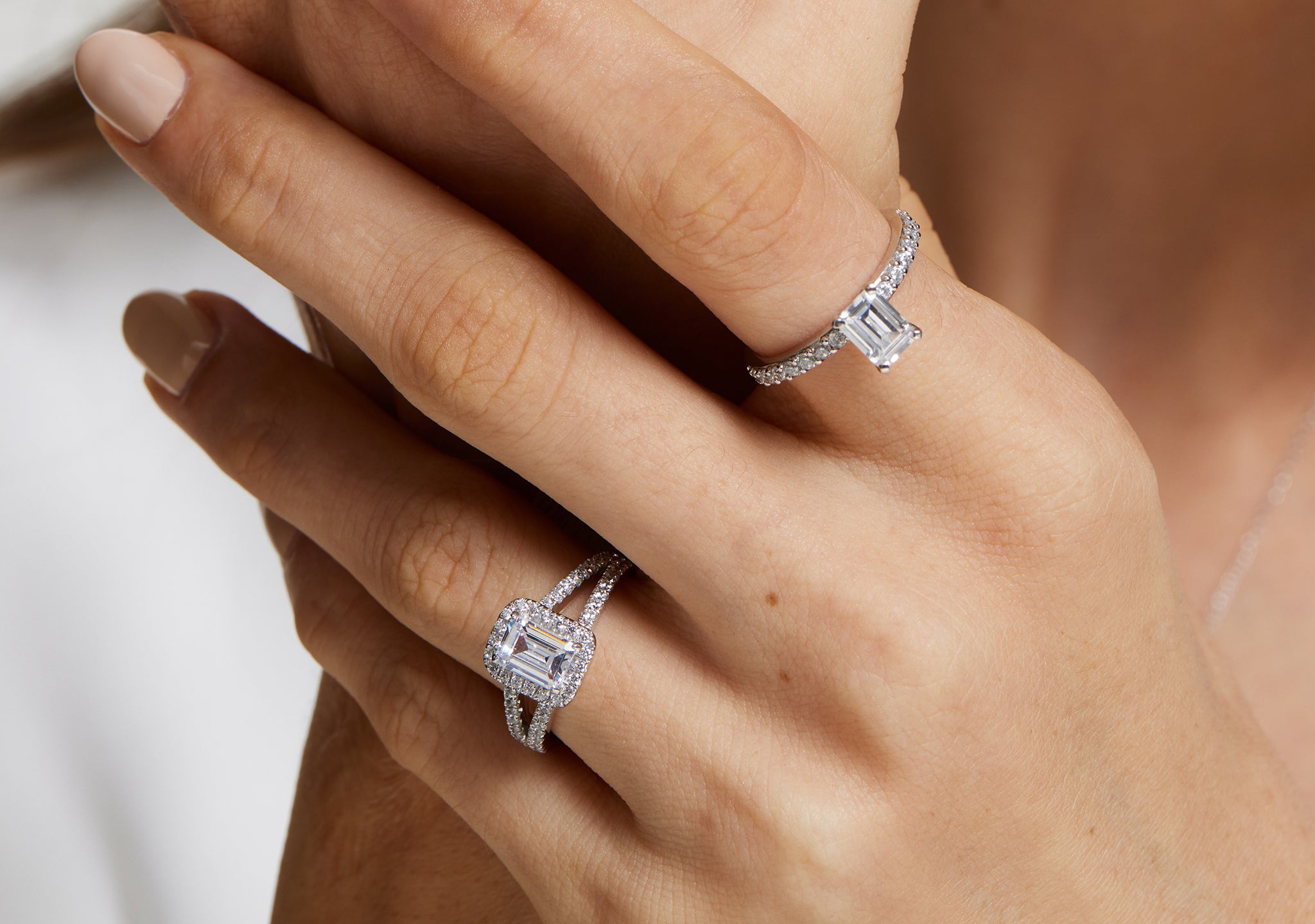 Being one of the most enduring styles for engagement rings, the emerald-cut exudes elegance with its clean lines and a captivating "Hall of Mirrors" effect. Described as a step-cut diamond, it skillfully captures and reflects abundant white and colored light through its 49 rectangular facets that ascend and descend. The overall depth of the cut, accentuated by its elongated shape, gives the impression of taking up more space on the finger. For those who prioritize size, an emerald-cut engagement ring can appear more substantial than its actual carat weight, making it a compelling choice.
