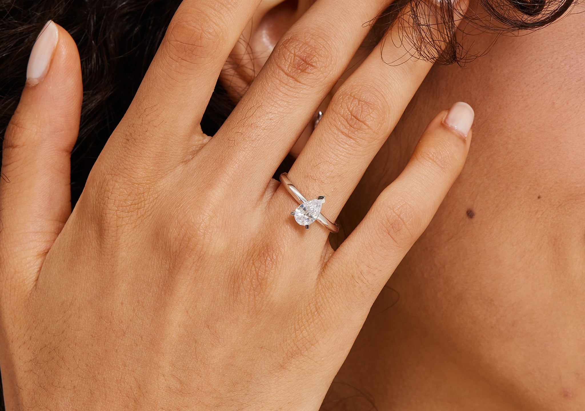 The pear-cut diamond, also known as the 'teardrop,' combines elements of both oval and marquise shapes, and are ideal for those who enjoy experimenting and seeking a distinctive appearance. When incorporating it into your engagement ring, you can wear the point either towards or away from your hand, offering versatile looks. however, the point facing away from the hand is the most popular way to wear it. Due to the shape's pointed tip, these rings work best in a bezel or half-V setting, as they're prone to chipping.