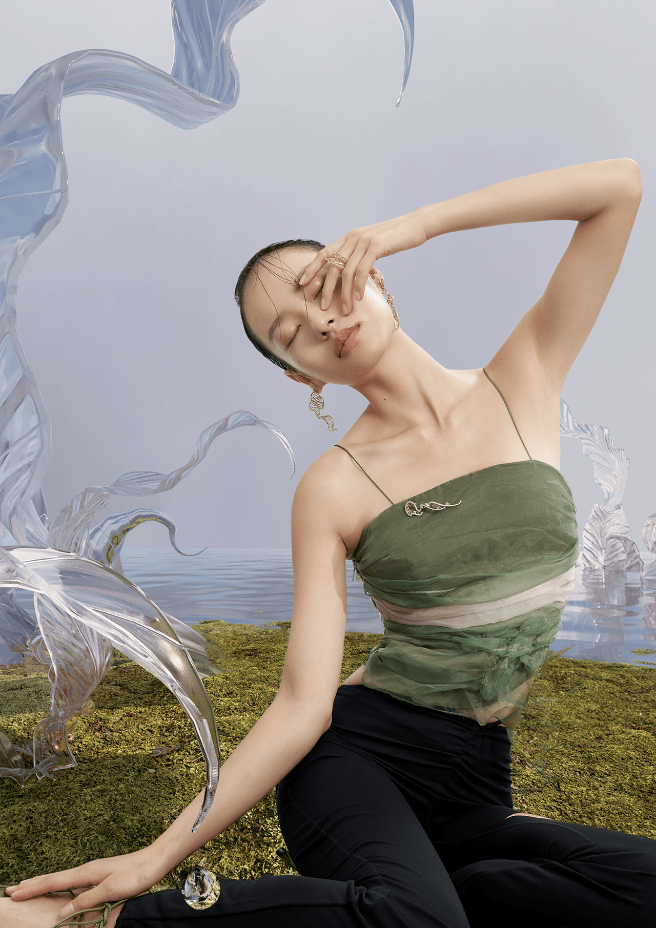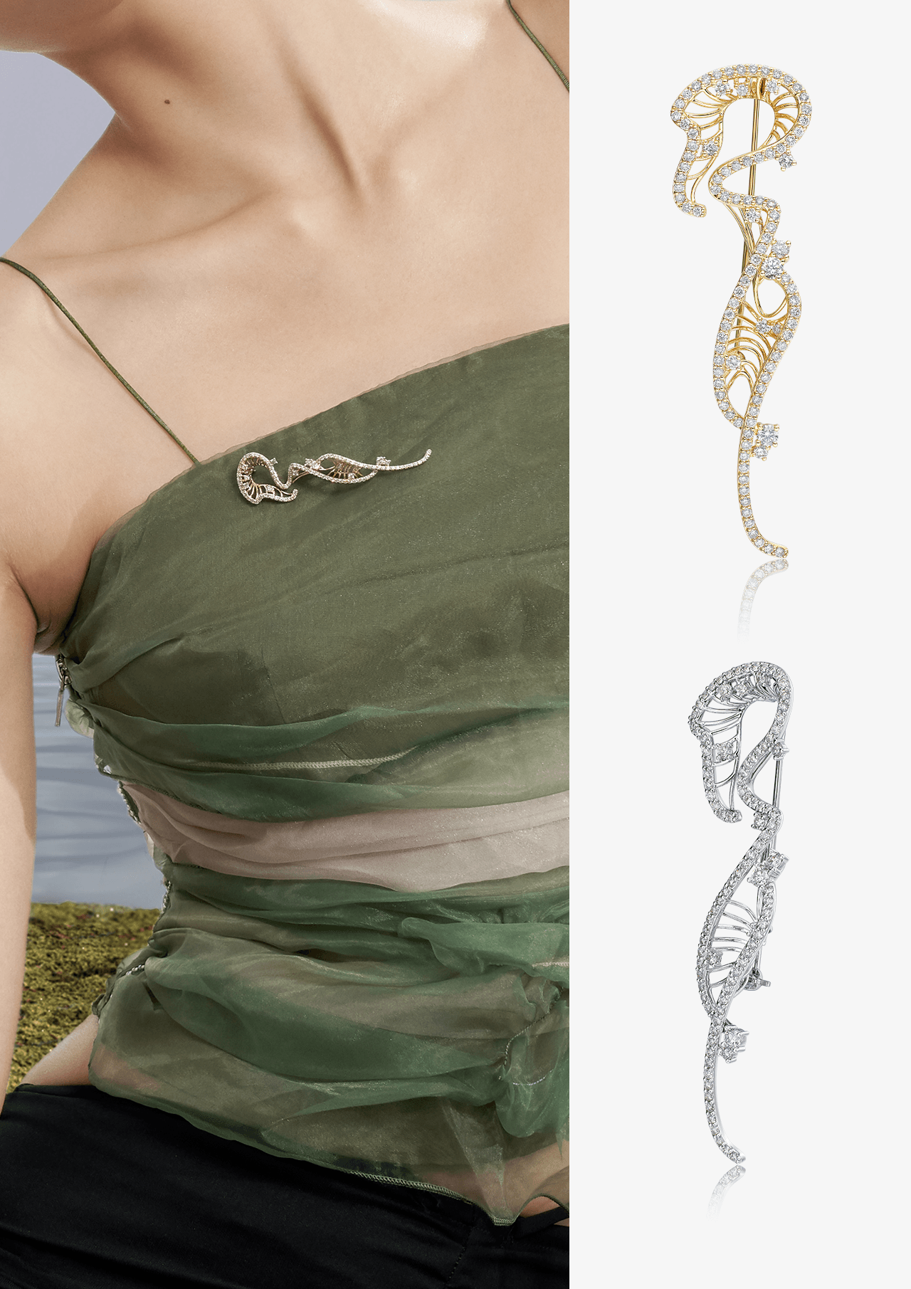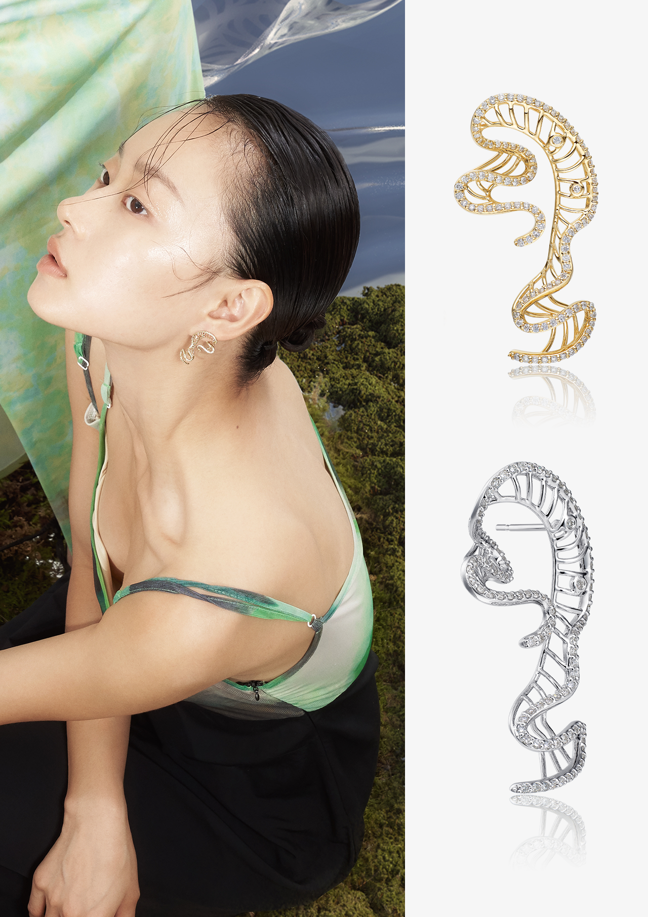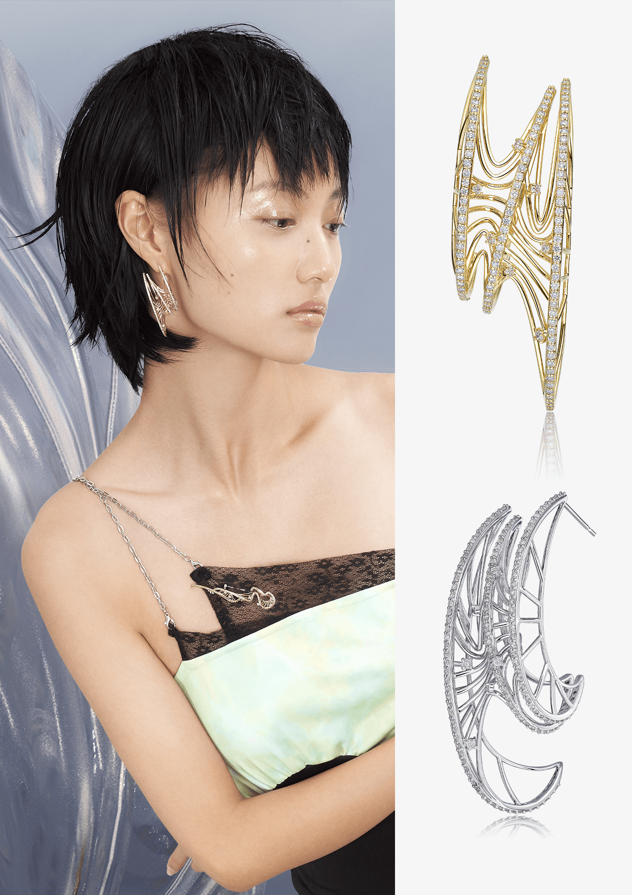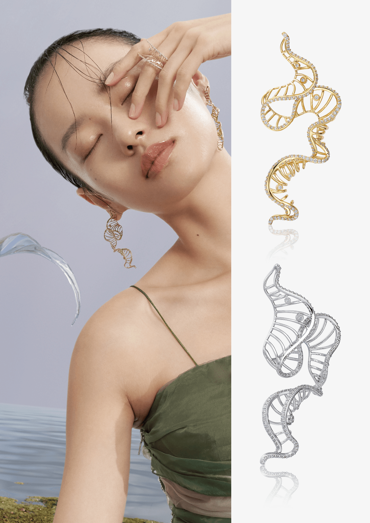 Winner of the prestigious silver A-Designs Awards in 2022, The Venation Collection captures the essence of what it means to be alive, grow and thrive. Inspired by the spiraling growth of plants, Venation presents “life” as a never-ending search in the same way plants strive for light, growing stronger and older in the process. Designer Yunmei Huang embeds lab-grown diamonds into each piece encased in an abstract 3D construction of 9-karat white and yellow gold, demonstrating the irregularity of growth and the sparks of life between each curve and spiral, a true demonstration of craftsmanship and technology in modern high fashion.