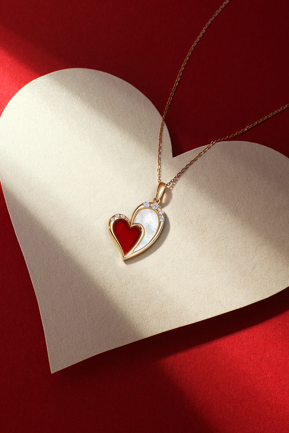 This pendant features a heart-shaped design, with 14k gold embracing two genuine hearts. The white mother-of-pearl symbolizes purity and gentleness, while the red agate represents a passionate and vivid heart. At the top, seven sparkling lab-grown diamonds are delicately set, adding to the pendant's elegance. The intertwining hearts symbolize the mutual affection and deep love between two individuals, creating a lingering sense of sweet romance. It's perfect as a confession Valentine’s idea.