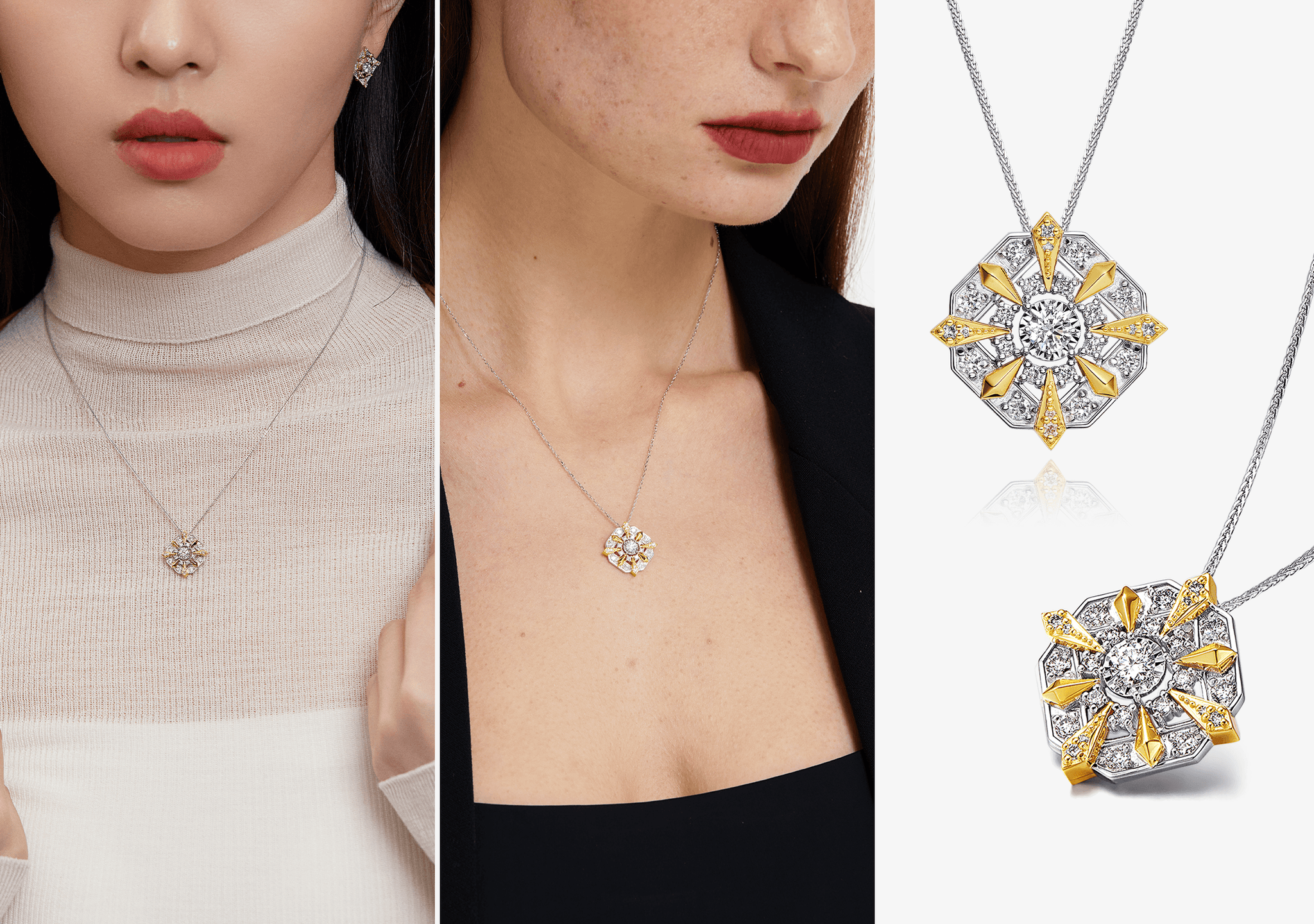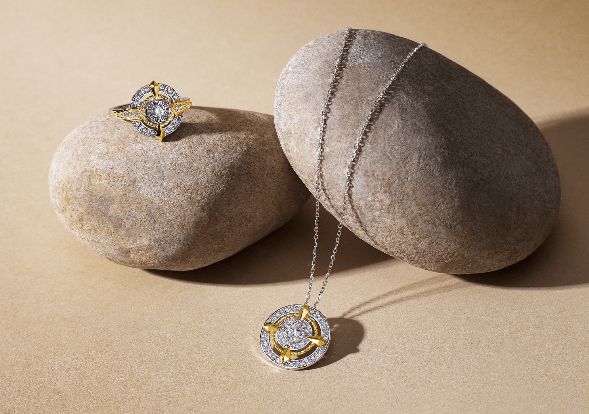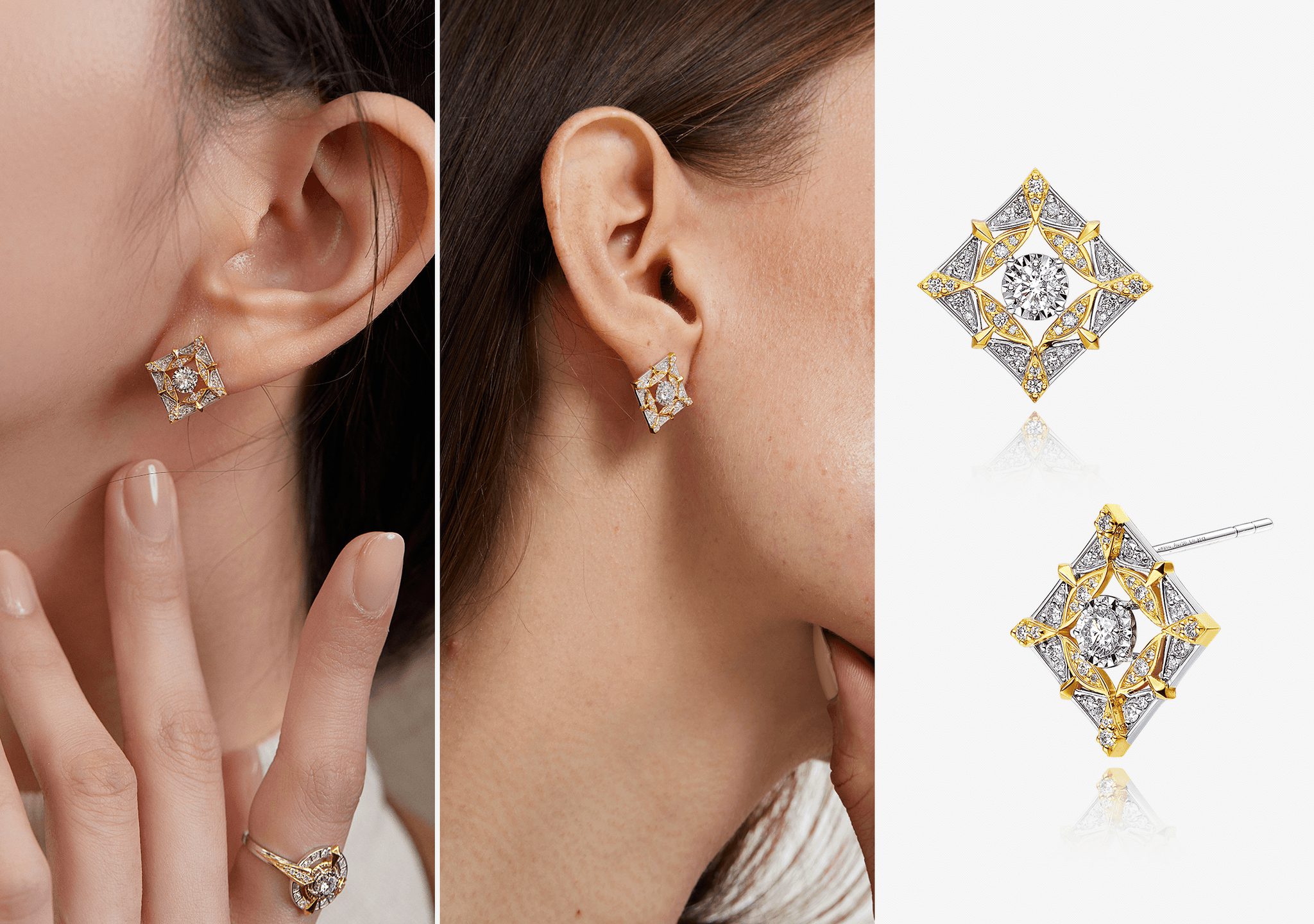 The compass pointer is a major design element in this collection. Symmetrical golden arrows symbolize the rays of the sun, radiating a sense of harmony and balance. The center lab-grown diamonds are set on antique-style openwork structures decorated with intricate patterns. The classic rhombus and round outlines bring out layered sophistication and brilliance of the the diamonds. The unique electroplating craft plays with light and shadow. Golden arrows shine through the silvery background, like piercing sunlight guiding you out of a storm, empowering you to conquer the waves in this rewarding journey.