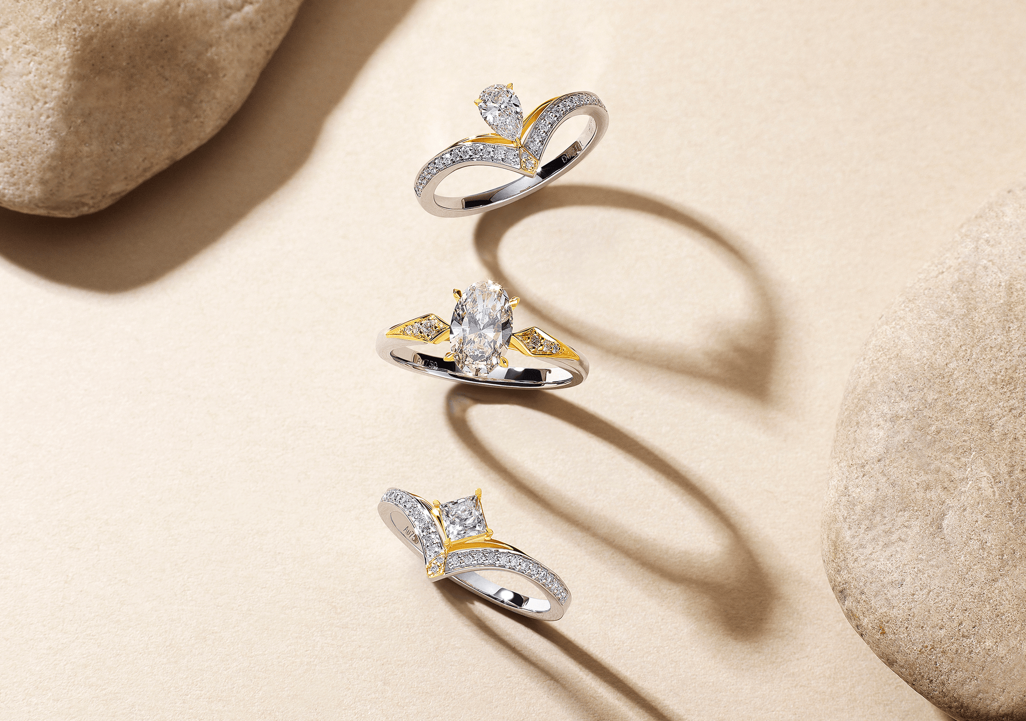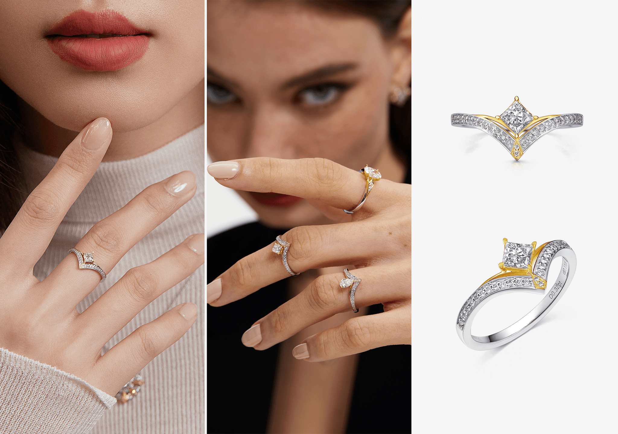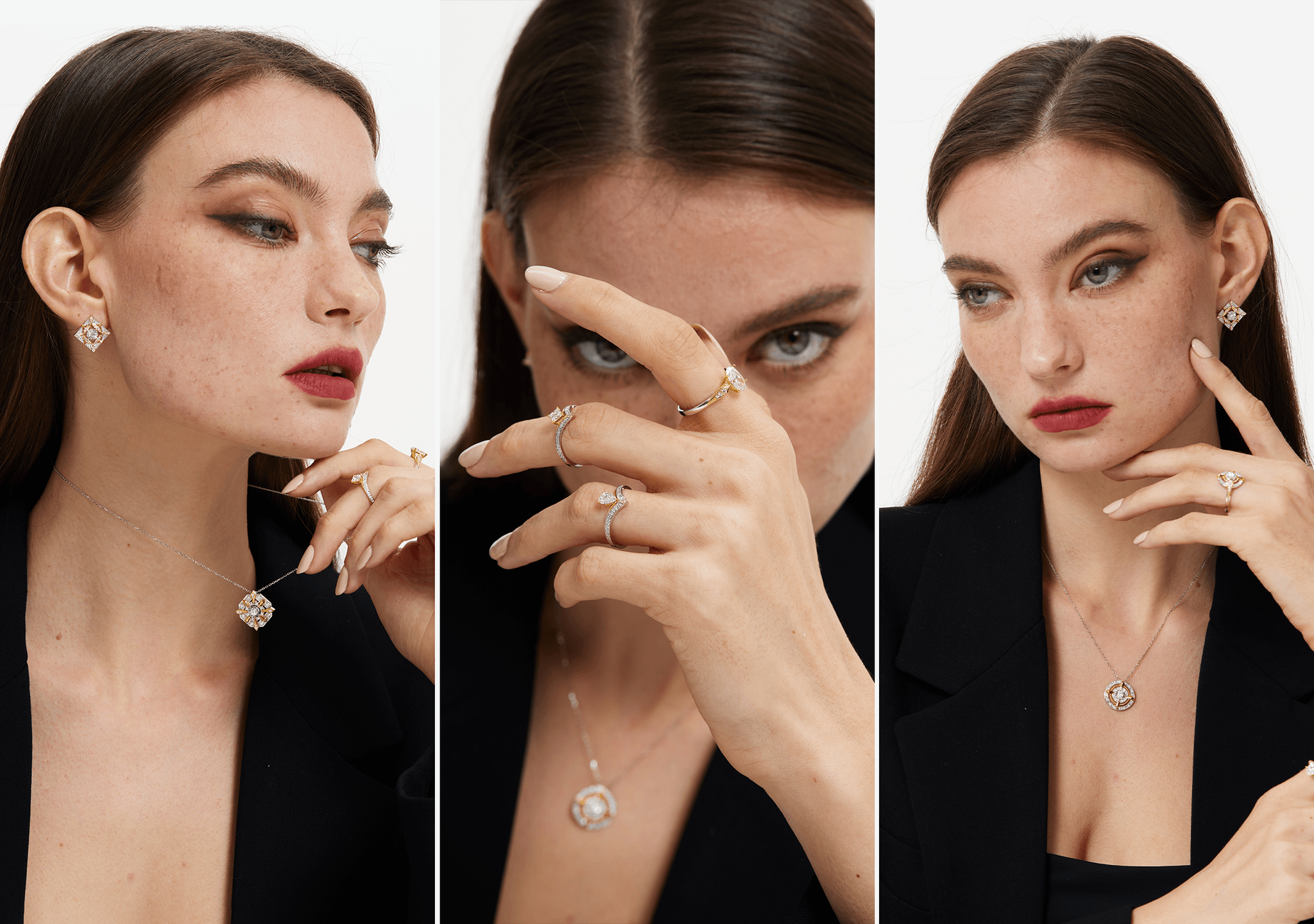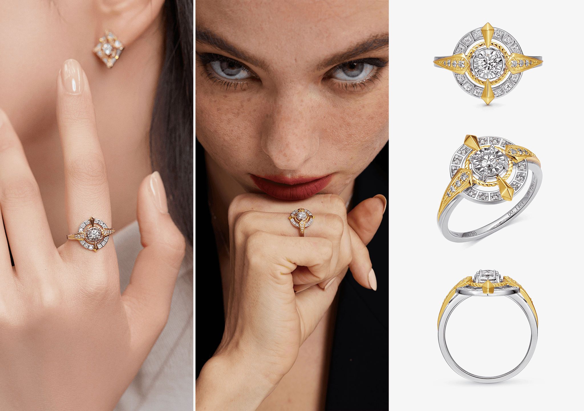 The compass pointer is a major design element in this collection. Symmetrical golden arrows symbolize the rays of the sun, radiating a sense of harmony and balance. The center lab-grown diamonds are set on antique-style openwork structures decorated with intricate patterns. The classic rhombus and round outlines bring out layered sophistication and brilliance of the the diamonds. The unique electroplating craft plays with light and shadow. Golden arrows shine through the silvery background, like piercing sunlight guiding you out of a storm, empowering you to conquer the waves in this rewarding journey.
