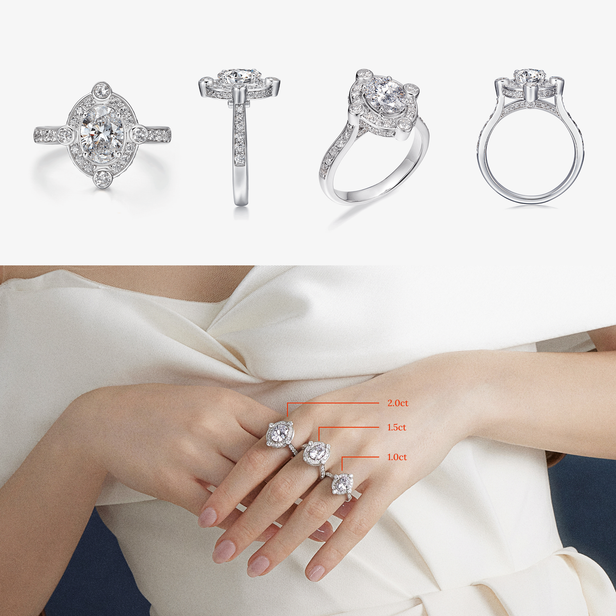 The Design: Our Greek Pantheon's Rhea Ring in White Gold is a uniquely designed halo diamond ring representing a diamond “clock”. The center oval-cut lab-grown diamond forms the face of the clock, and the four round lab-grown diamonds in every direction signify the dial. The Rhea ring is a timeless classic. Like the flow of time, love is also eternal under the blessings of the goddess Rhea.