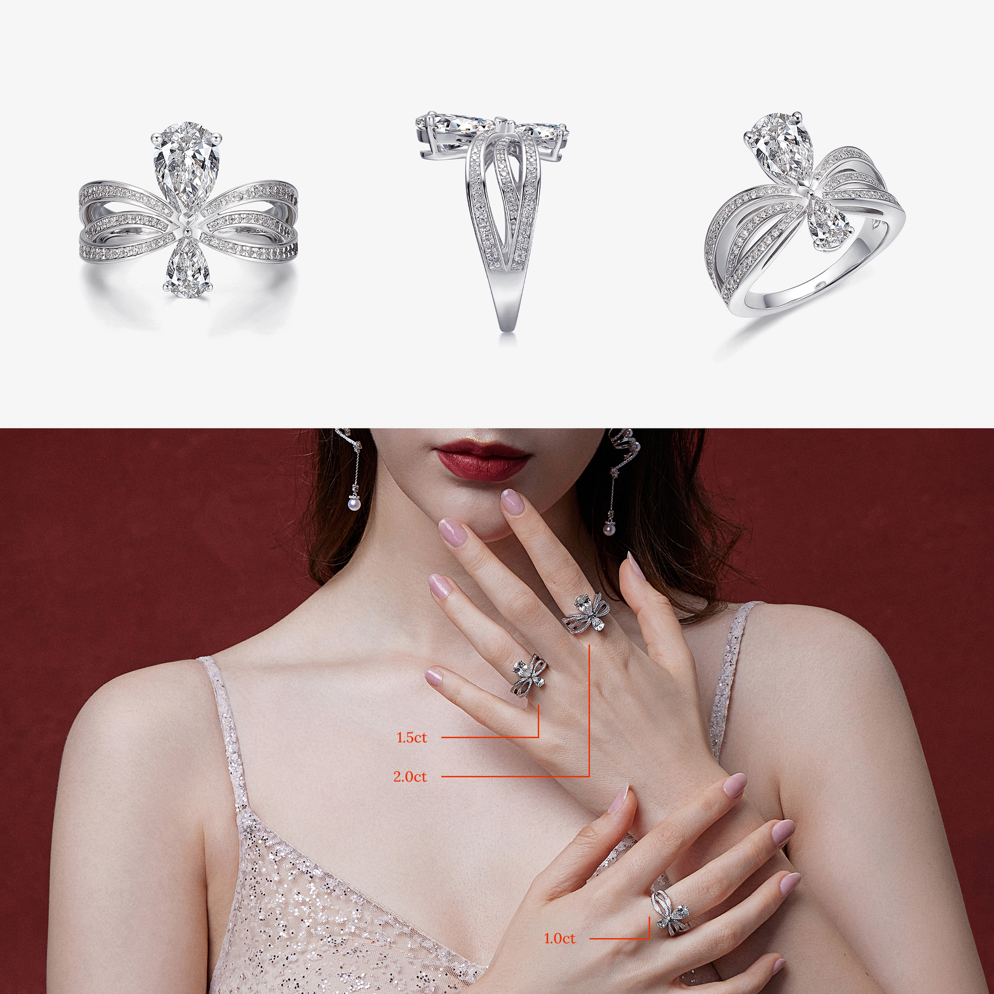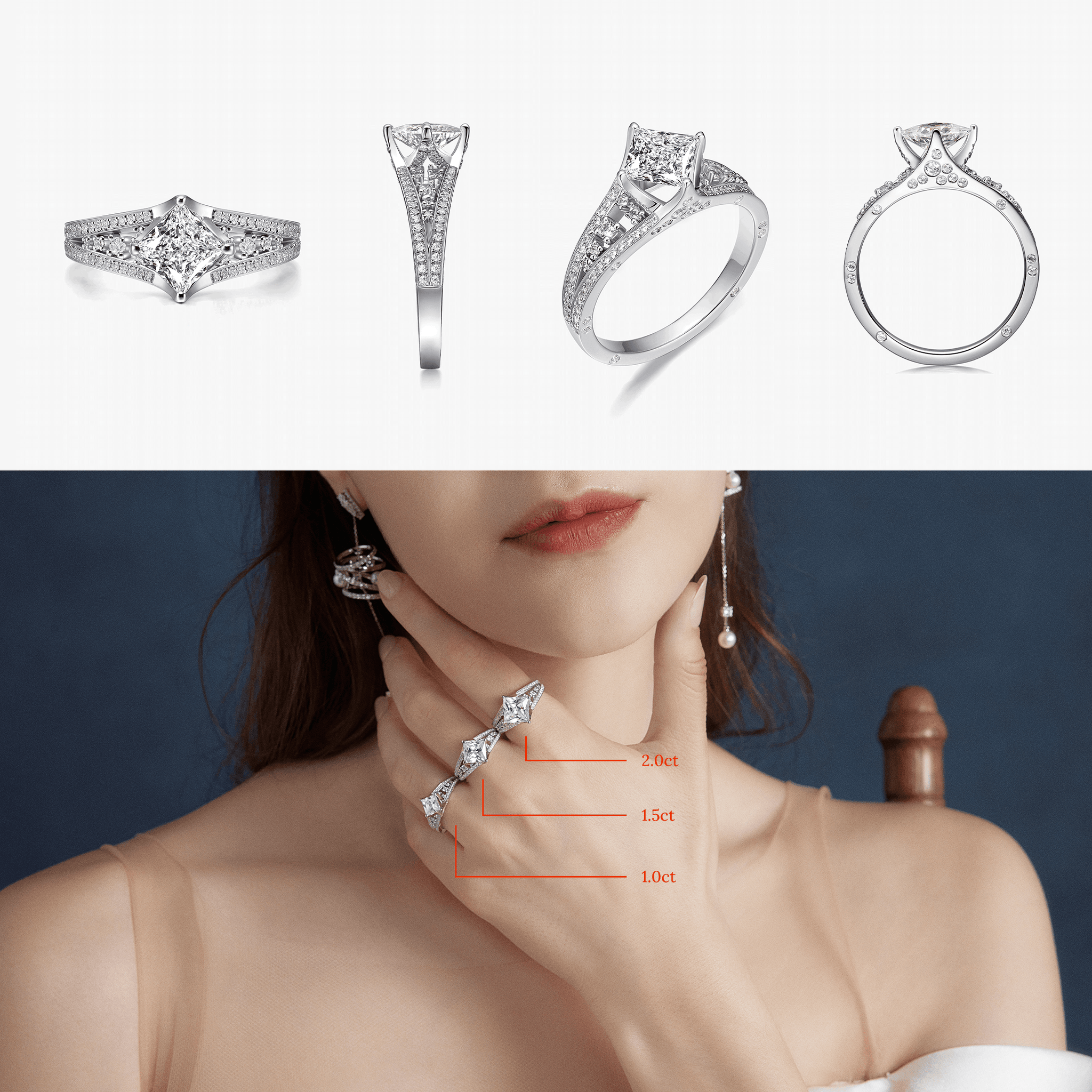 You will find 8 different cuts in these 8 promise rings, including round-cut, oval-cut, pear-cut, emerald-cut, radiant-cut, cushion-cut, princess-cut, and marquise-cut. The diamonds are lab-grown and set with a variety of crafts to unveil their utmost beauty.