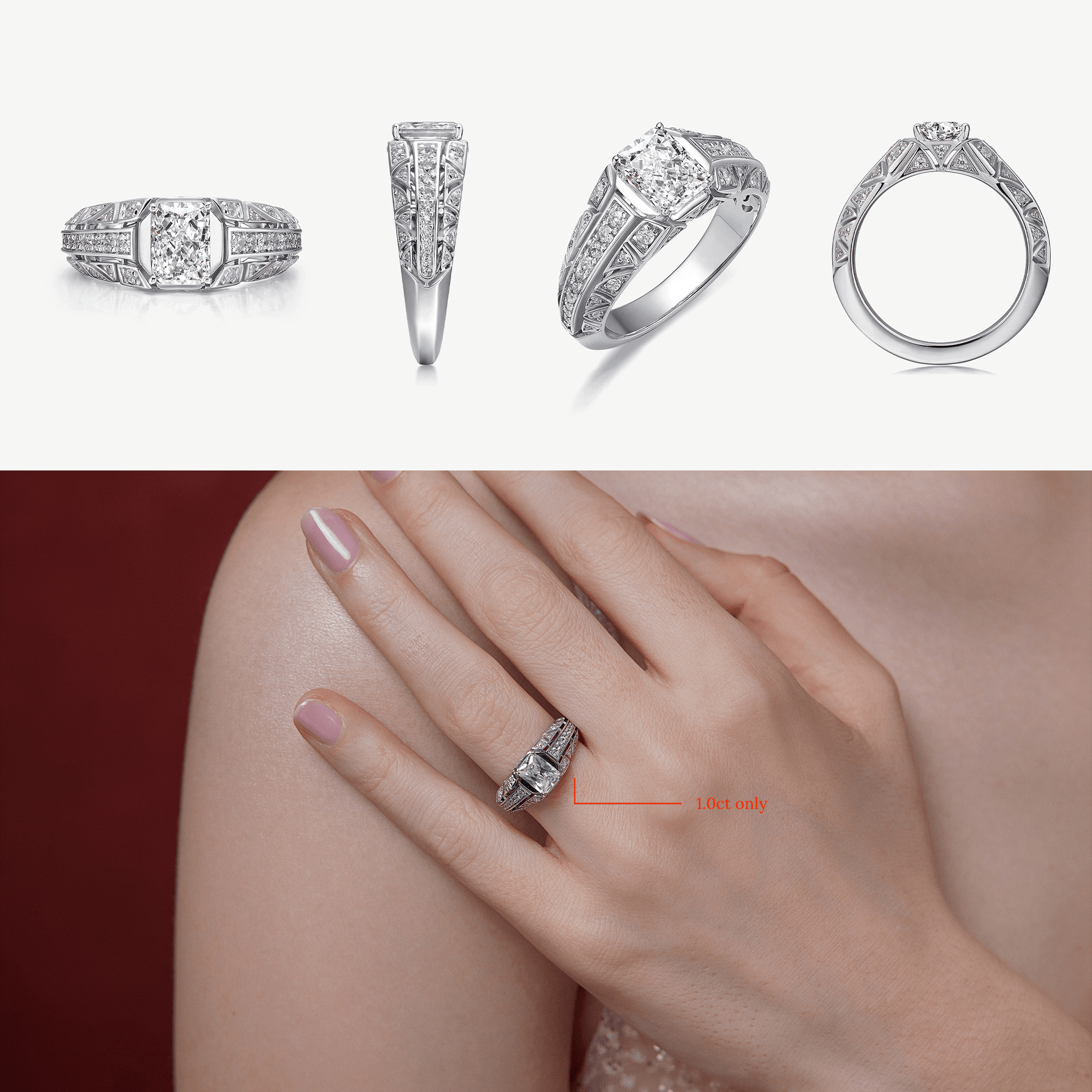 The Design: To celebrate the Goddess Gaea’s power of creation, the Gaea Promise Ring is an extravagant halo lab-grown diamond ring. Melee diamonds of different cuts are encrusted onto the waving ribbons that form the ring band, embracing the cushion-cut center stone. This promise ring resembles an exquisite wreath, radiating the beauty of exuberance.