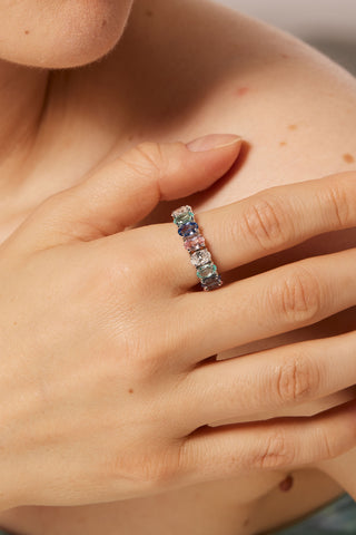 OVAL-CUT LAB-GROWN CORNFLOWER SAPPHIRE, DIAMOND, YAG PARAIBA & PINK SAPPHIRE VIBRANT ETERNITY RING IN 18K GOLD