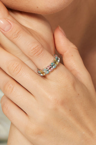 OVAL-CUT LAB-GROWN PINK SAPPHIRE, PARAIBA YAG & YELLOW SAPPHIRE VIBRANT ETERNITY RING IN 18K GOLD