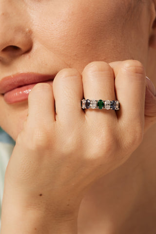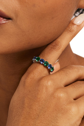 OVAL-CUT LAB-GROWN SAPPHIRE, EMERALD & DIAMOND VIBRANT ETERNITY RING IN 18K GOLD