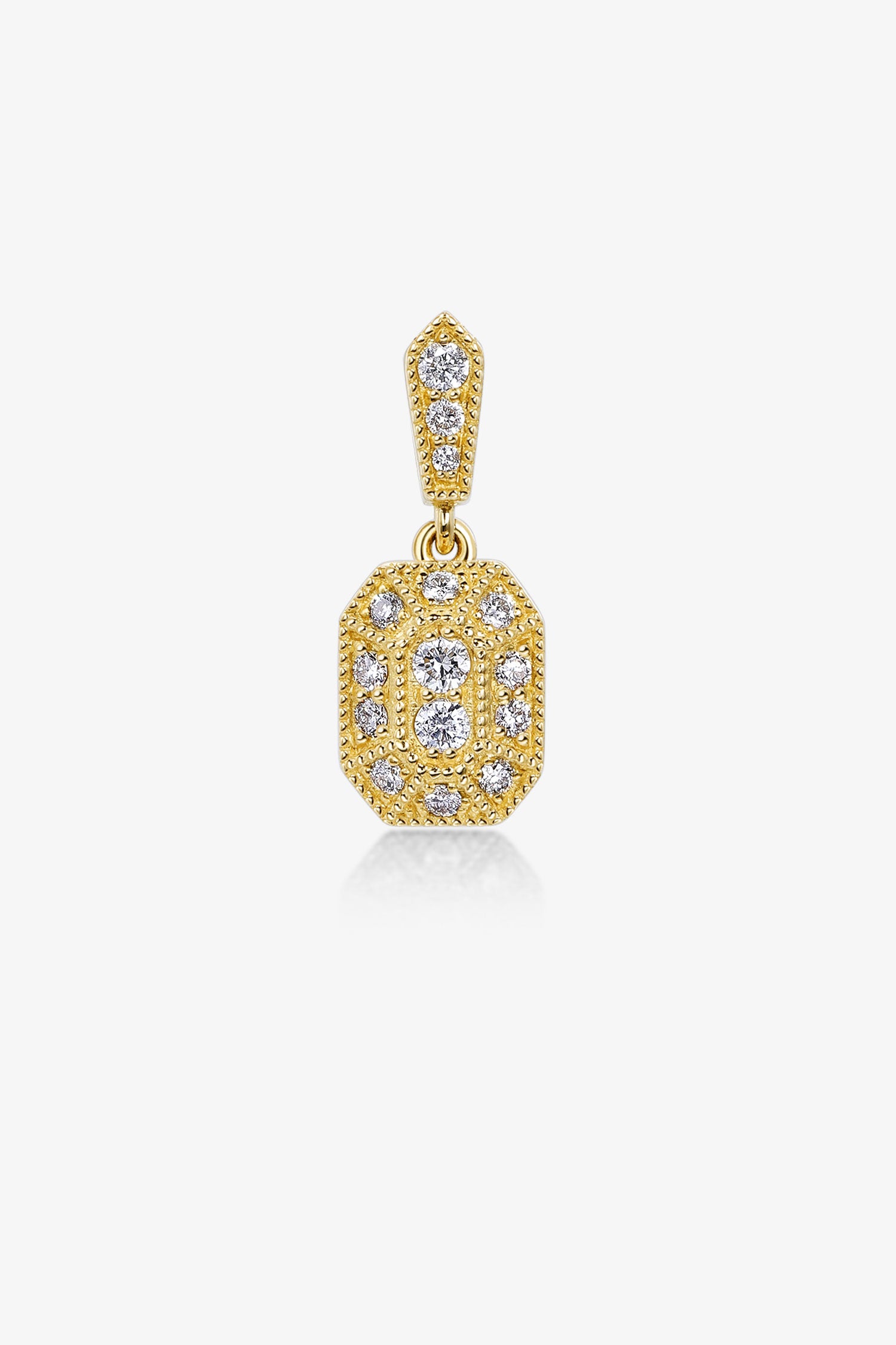 From a circle to a rhombus and finishing with a pear shape, each geometric element is micro-prong set with lab-grown diamonds and framed by vintage beads. Crafted in 9K yellow gold, the pendant drapes elegantly along your neckline, where the diamonds and beads sparkle with every subtle movement, highlighting the layered rhythm of the design.