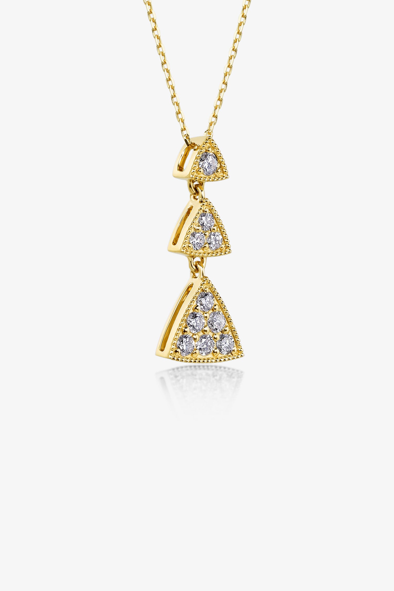 This necklace features three cascading triangles, each micro-prong set with lab-grown diamonds and framed with vintage beads. Crafted in 9K yellow gold, it lays gracefully along the neckline, balancing sharp geometry with a refined shimmer that moves effortlessly with you.