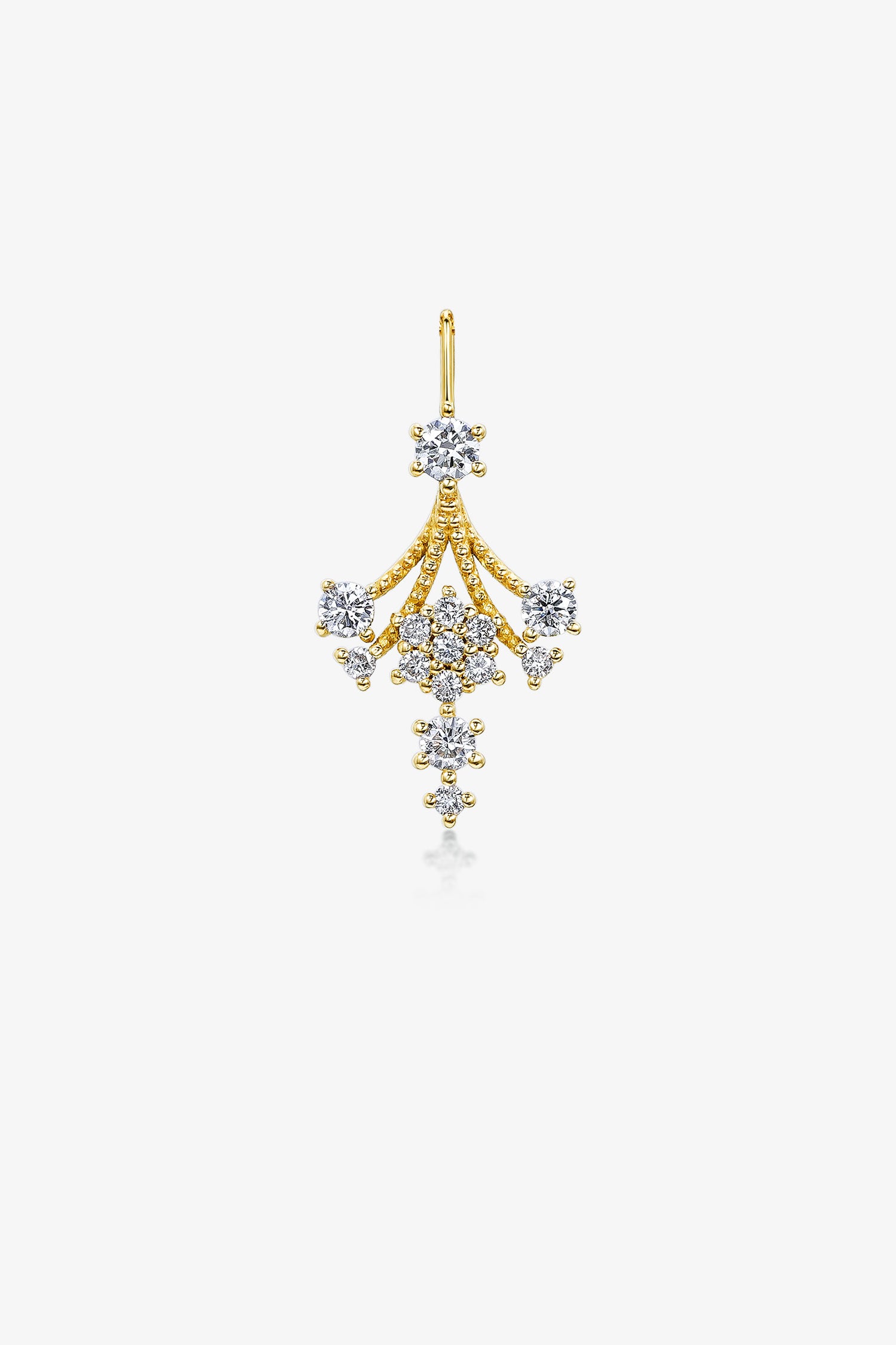 Defined by a bold geometric silhouette, this pendant is crafted in 9K yellow gold and micro-prong set with shimmering melee lab-grown diamonds. Vintage beads frames the design, lending texture and a timeless touch to its structured form. The precise lines meet soft brilliance, creating a look that feels both refined and fluid, reflecting light beautifully with every movement.