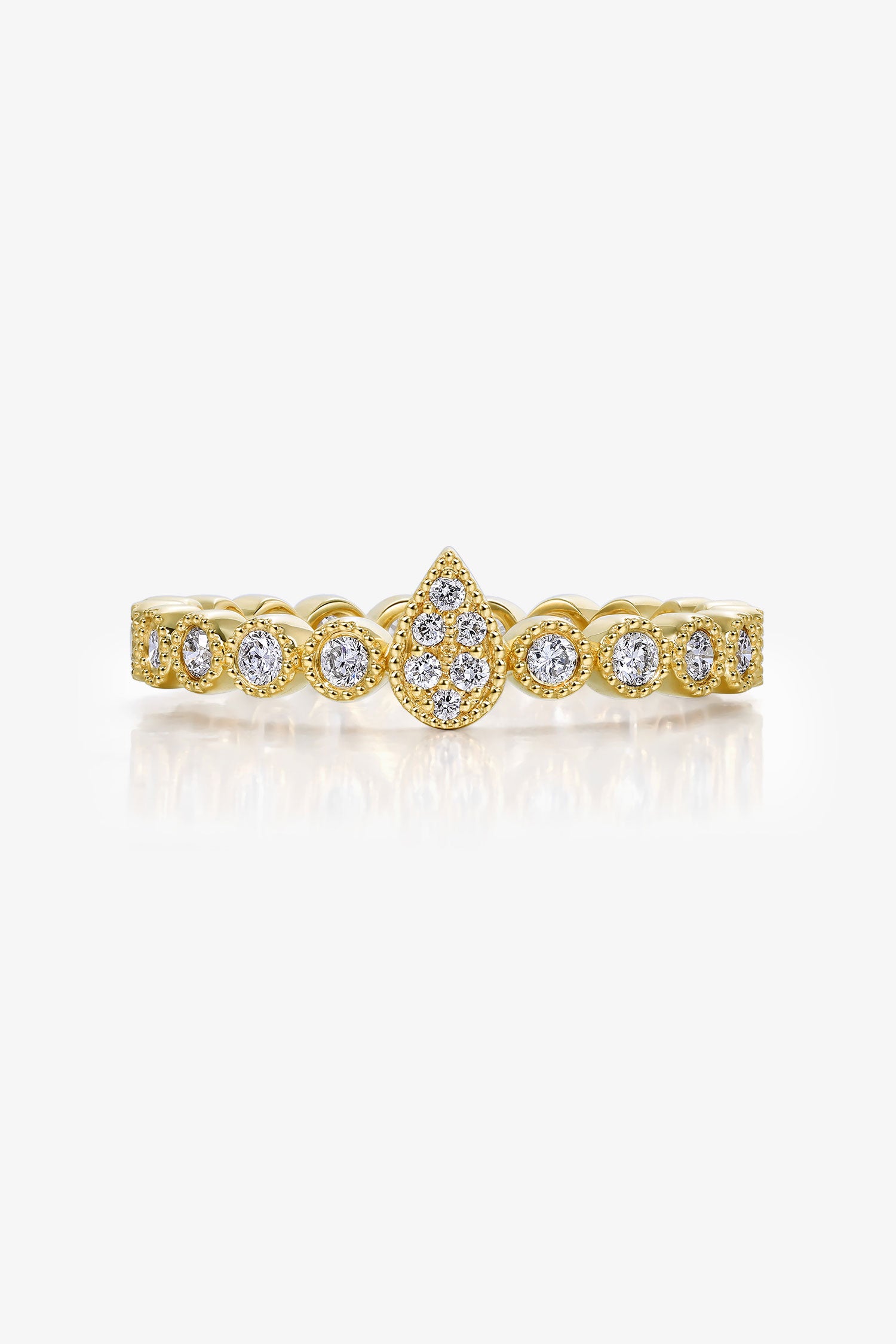 Crafted in 9K yellow gold, this ring features vintage beads along the edges, adding subtle texture and depth. A continuous row of round-cut lab-grown diamonds delivers radiant sparkle, while the pear-shaped center, accented with micro-prong setting diamonds, creates a striking focal point. Balancing geometric lines with vintage charm, it reflects a timeless elegance that complements both modern and classic styles.